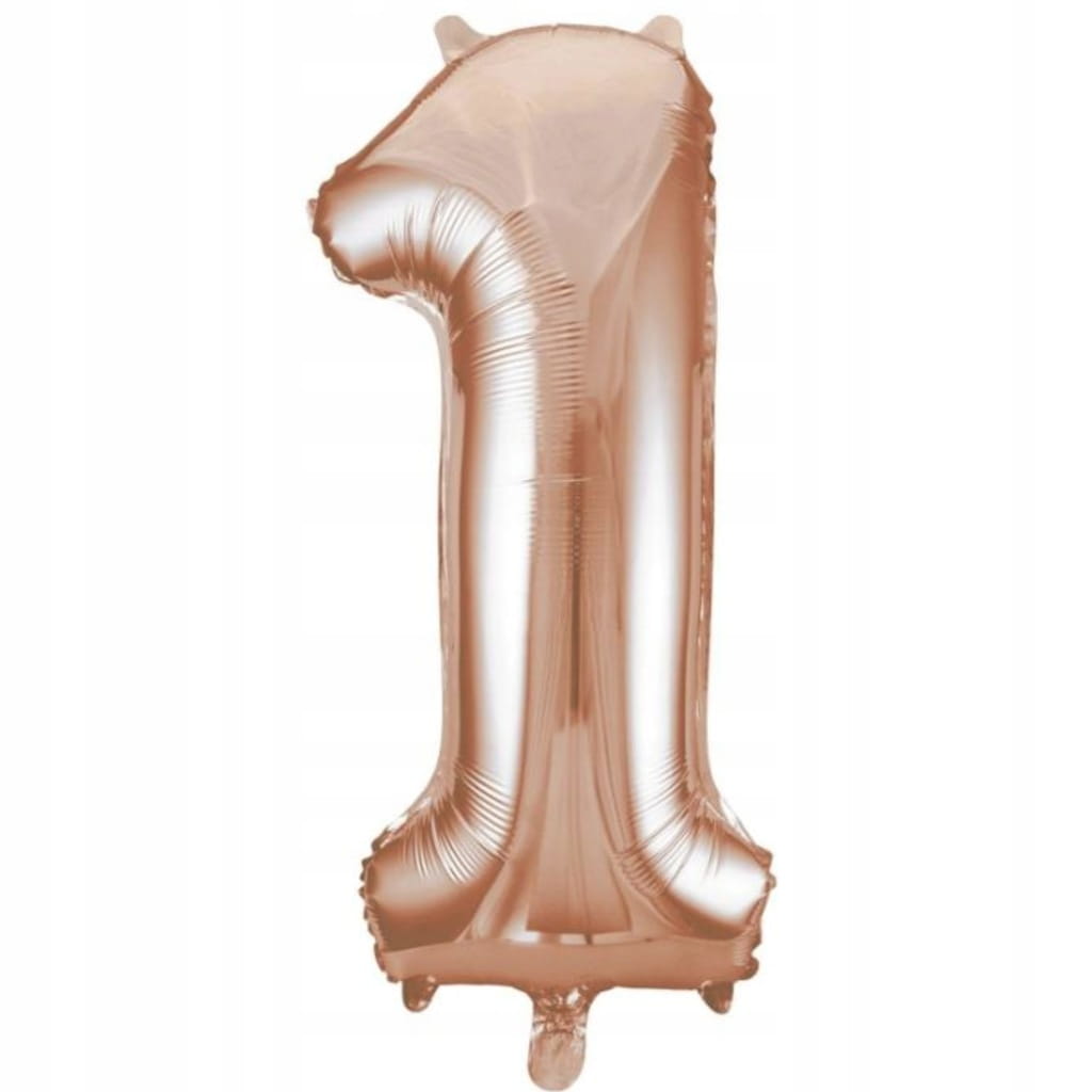 Metaliczny balon foliowy w kształcie cyfry 1 w kolorze różowego złota, o wysokości ok. 81 cm. Do napełnienia powietrzem lub helem – sprawdzi się jako dekoracja na roczek i urodziny.