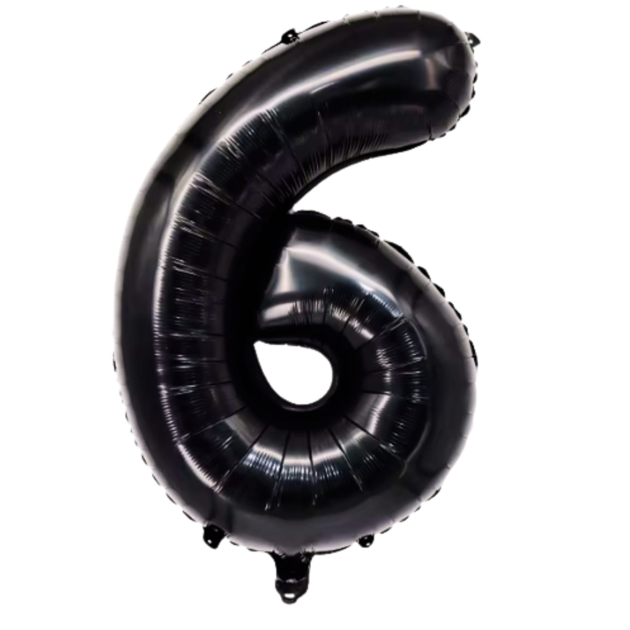 Balon foliowy w kształcie cyfry 6 w kolorze czarnym, chromowanym. Rozmiar po napompowaniu: 81 cm. Do napełniania powietrzem lub helem, 1 sztuka w opakowaniu.