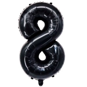 Balon foliowy w kształcie cyfry 8 w kolorze czarnym, chromowanym. Rozmiar po napompowaniu: 81 cm. Do napełniania powietrzem lub helem, 1 sztuka w opakowaniu.