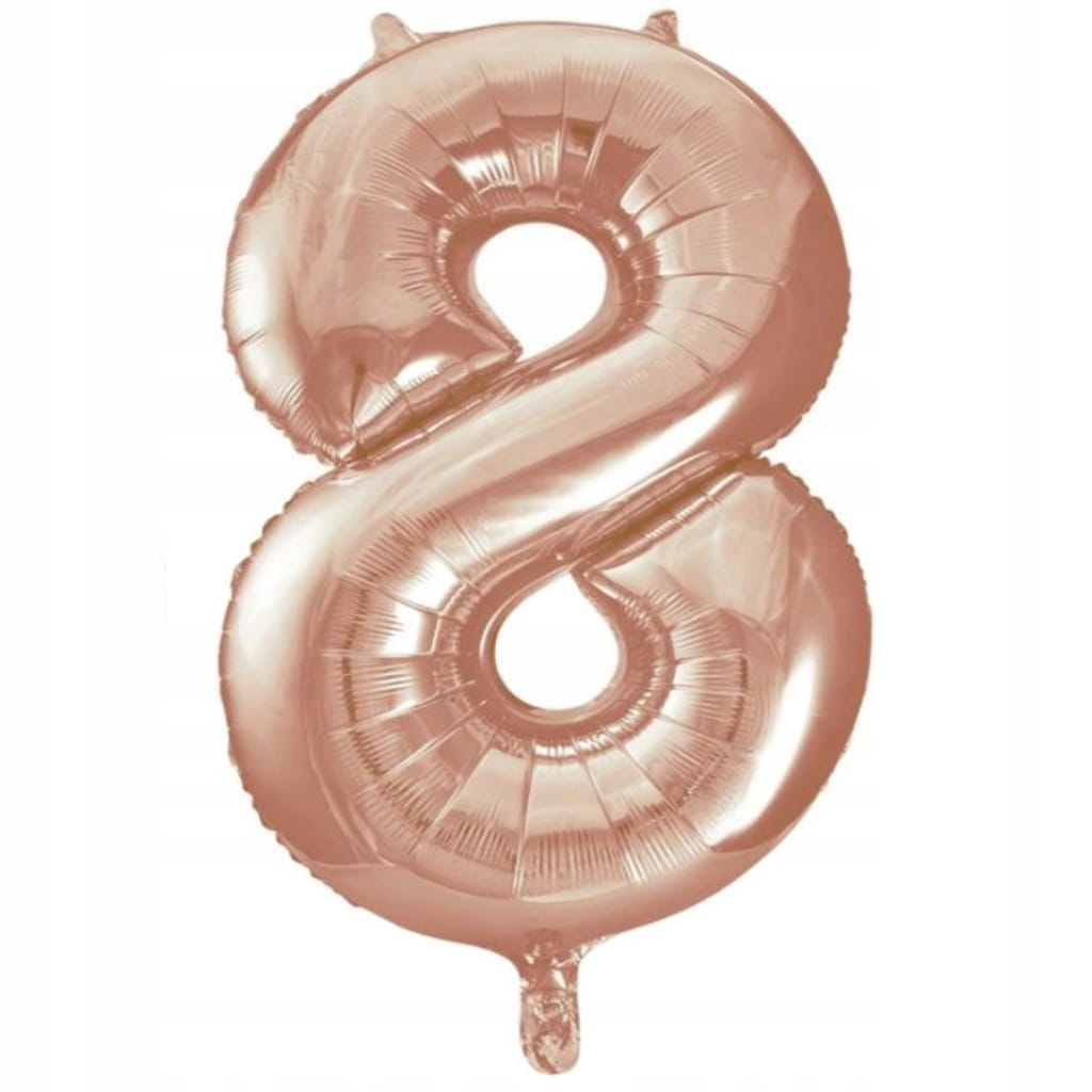 Metaliczny balon foliowy w kształcie cyfry 8 w kolorze różowego złota, wysokość ok. 81 cm. Do napełnienia powietrzem lub helem – dekoracja na urodziny, roczek i jubileusze.