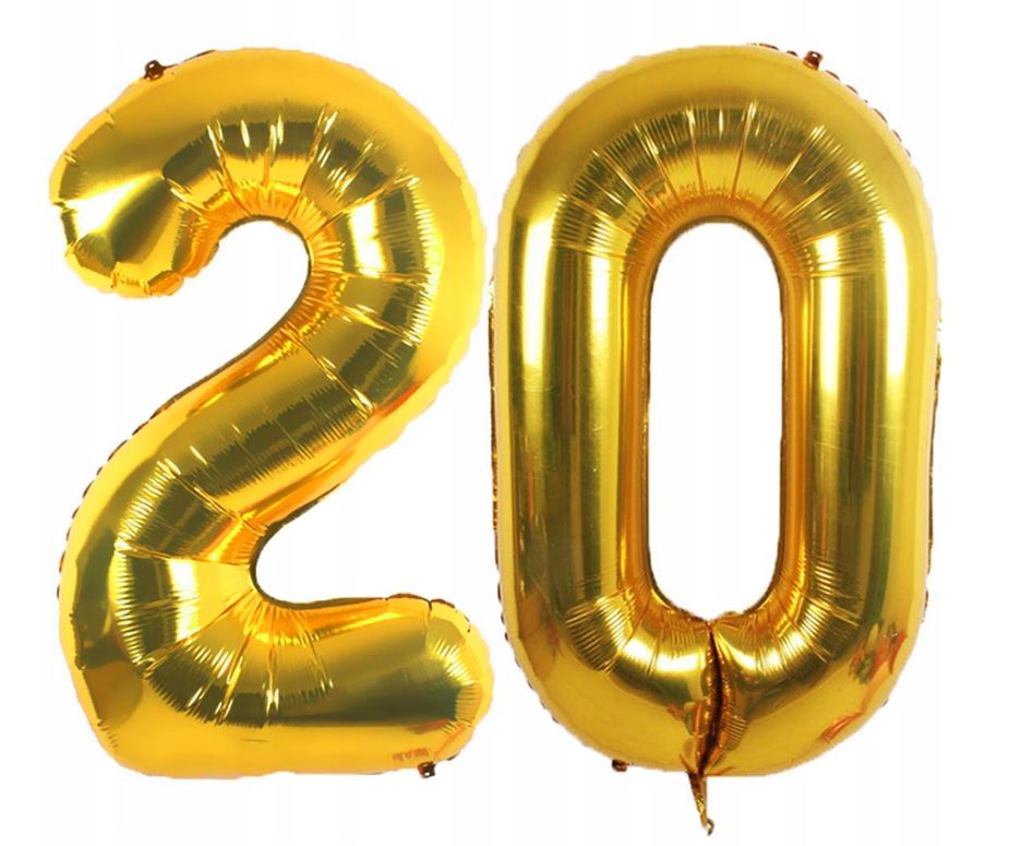 Złoty, metaliczny balon foliowy w formie cyfr “20”, o wysokości ok. 81 cm. Zestaw zawiera dwie osobne cyfry: 2 i 0. Do napełnienia powietrzem lub helem.