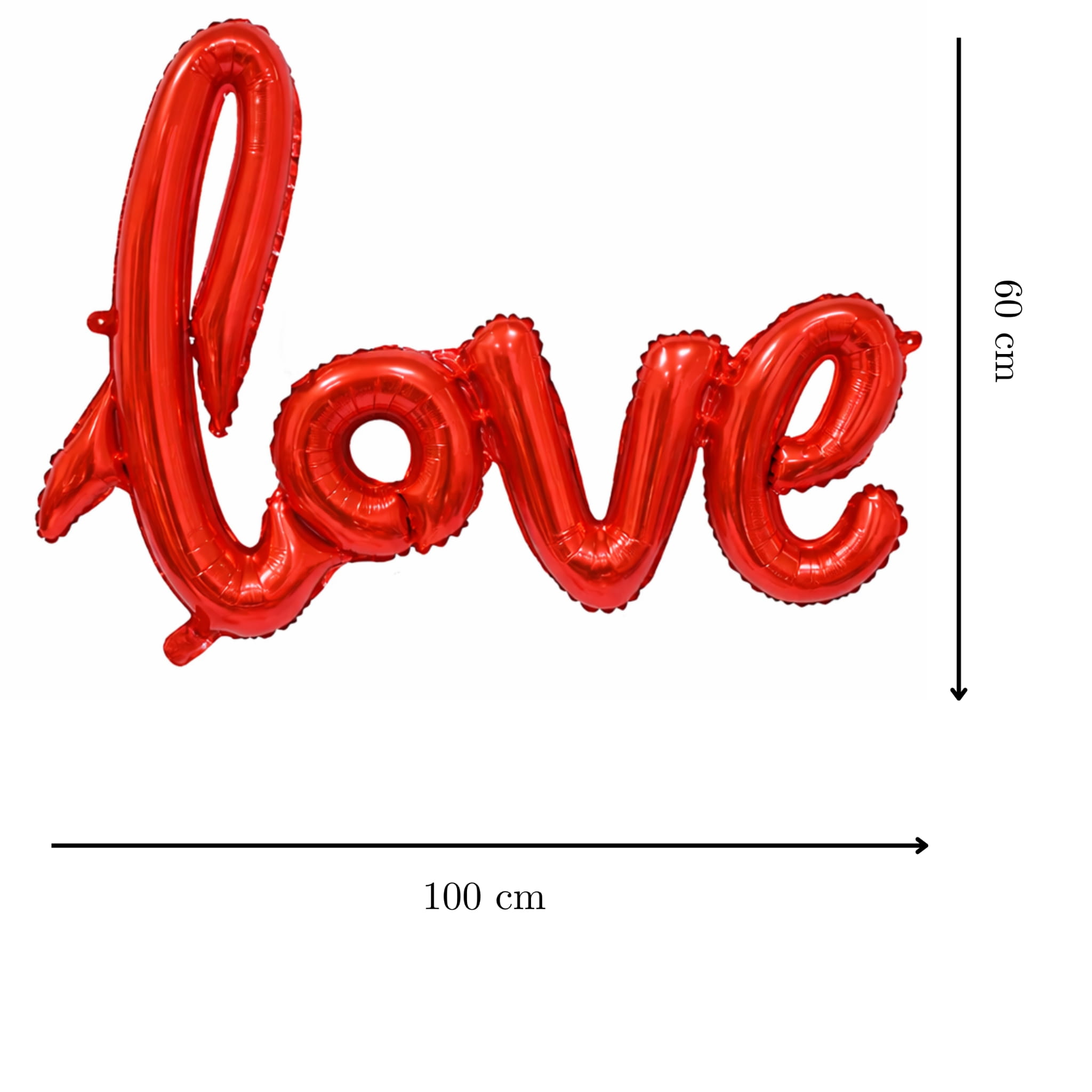 Duży balon foliowy z napisem LOVE w kolorze czerwonym, o wymiarach 100 × 60 cm. W opakowaniu jest 1 sztuka, a balon można napełniać powietrzem lub helem.