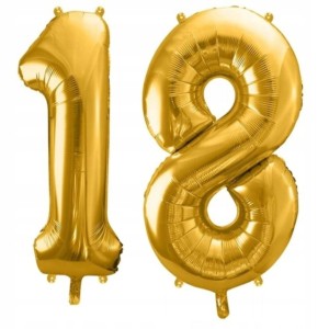 Zestaw 2 balonów foliowych w kształcie cyfr 1 i 8, tworzących liczbę 18. Kolor złoty, wykończenie metaliczne, wysokość ok. 81 cm. Balony do napełniania powietrzem lub helem.