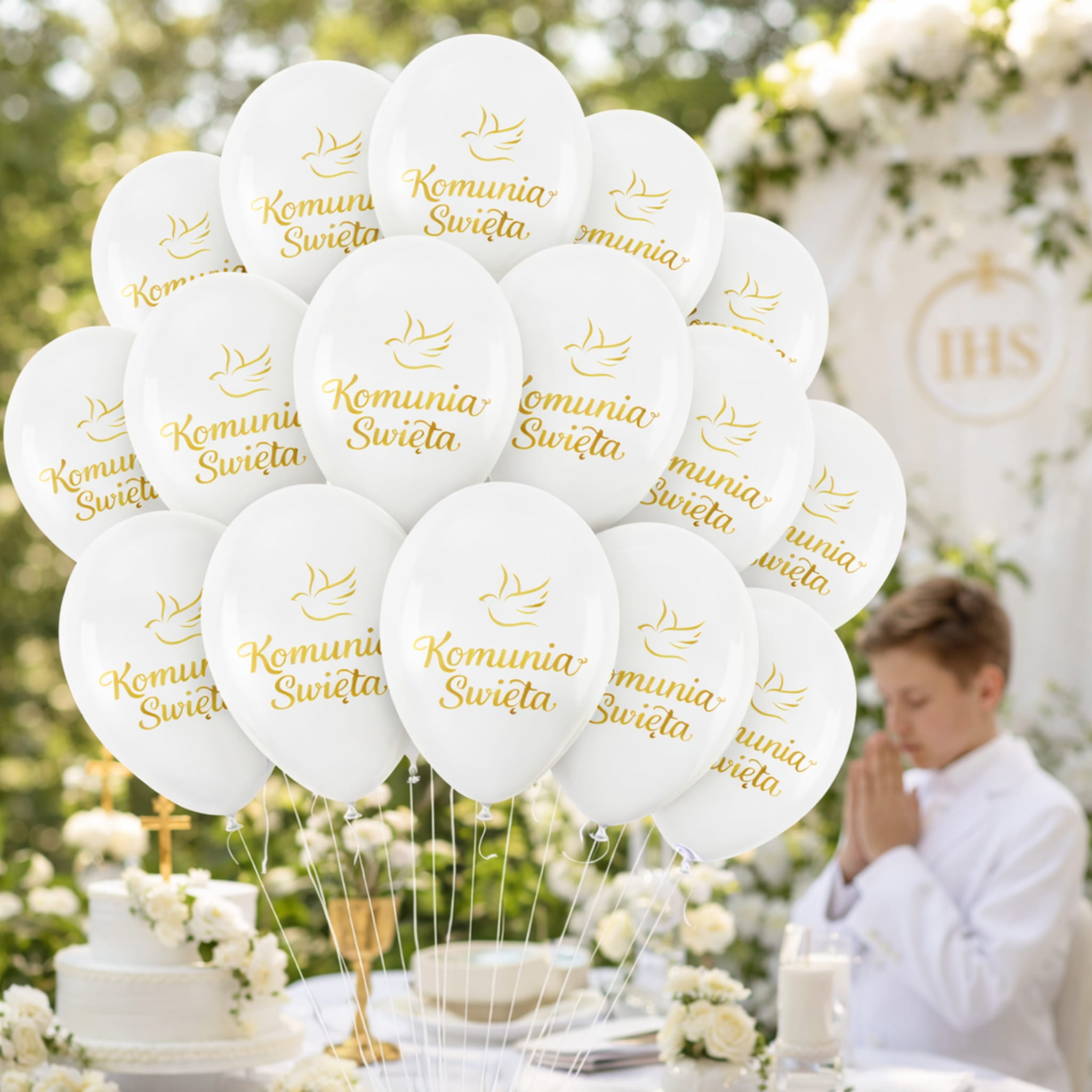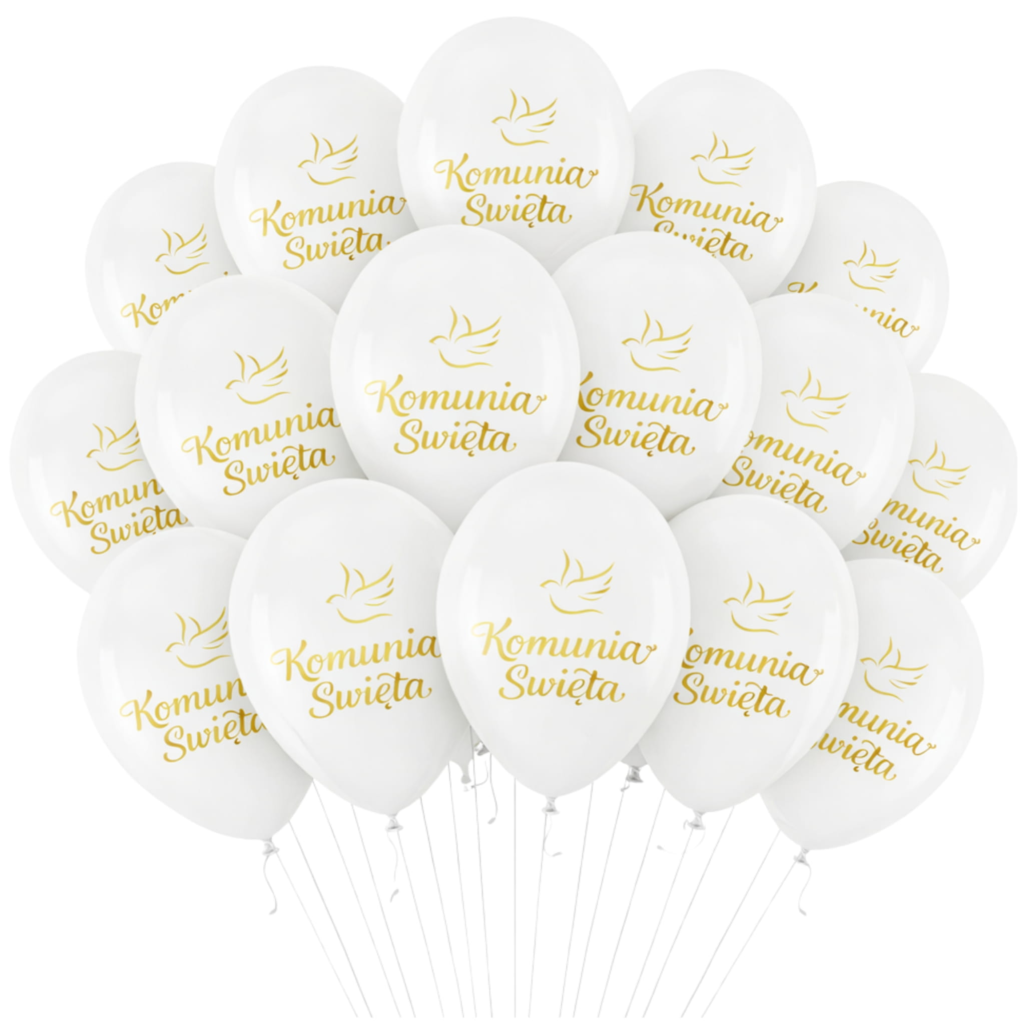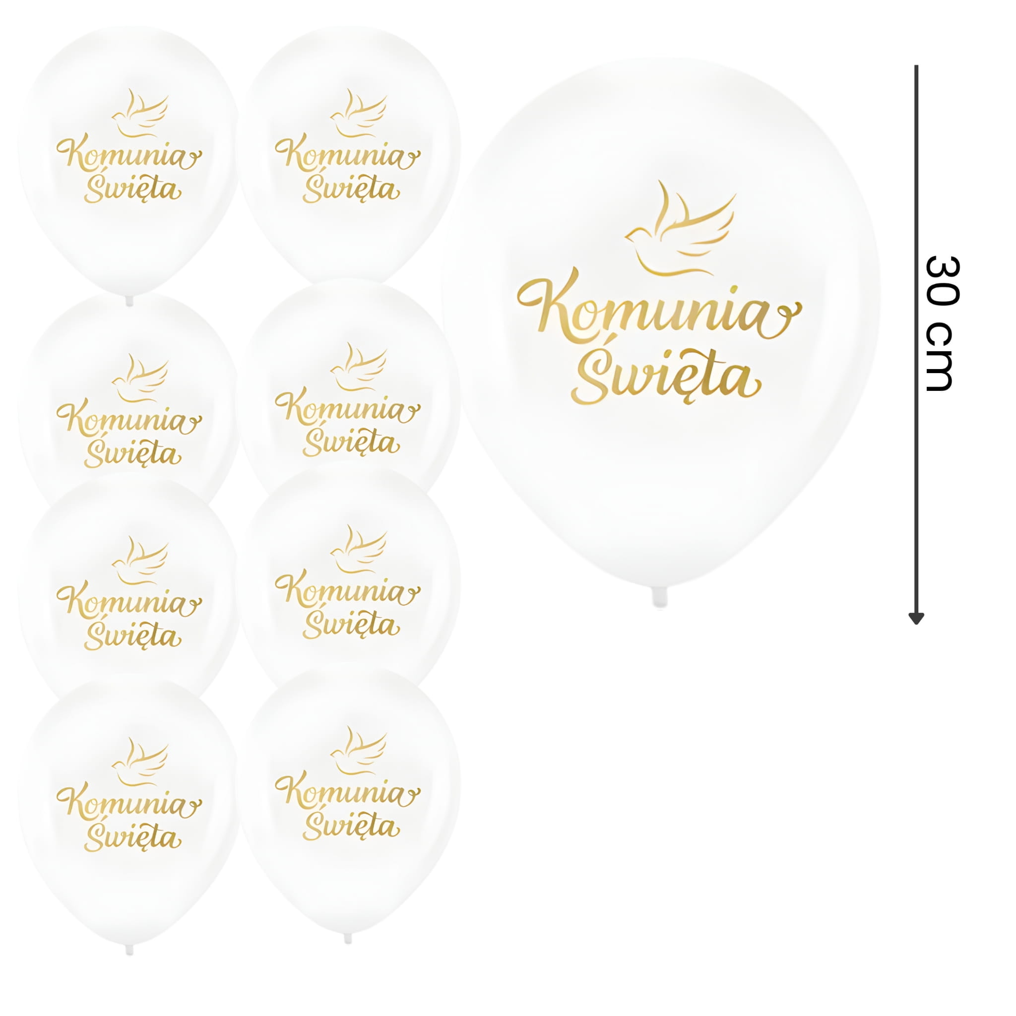 Białe balony lateksowe z nadrukiem „Komunia Święta” do dekoracji przyjęcia komunijnego. Zestaw zawiera 10 sztuk balonów o rozmiarze ok. 30,5 cm , do napełniania powietrzem lub helem.