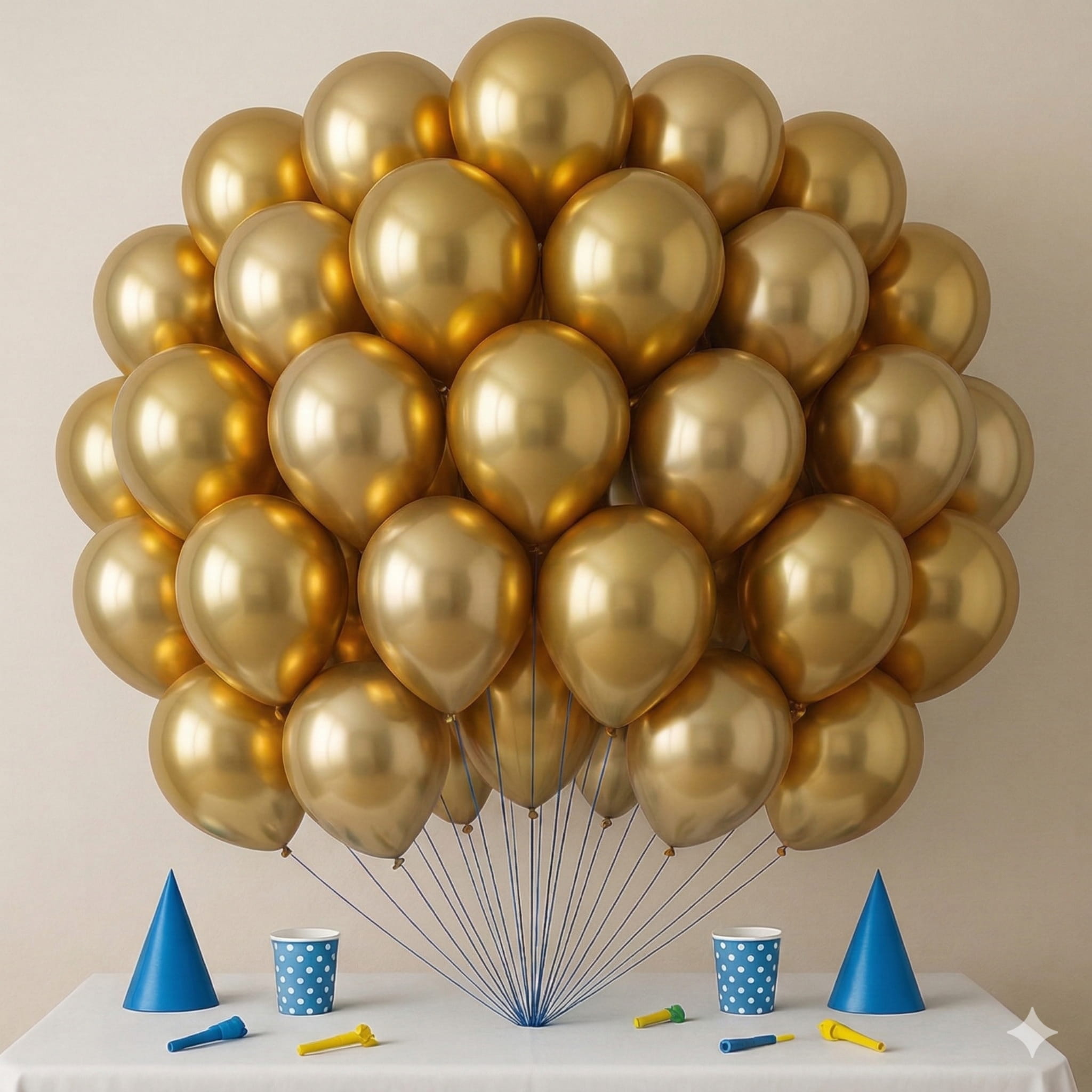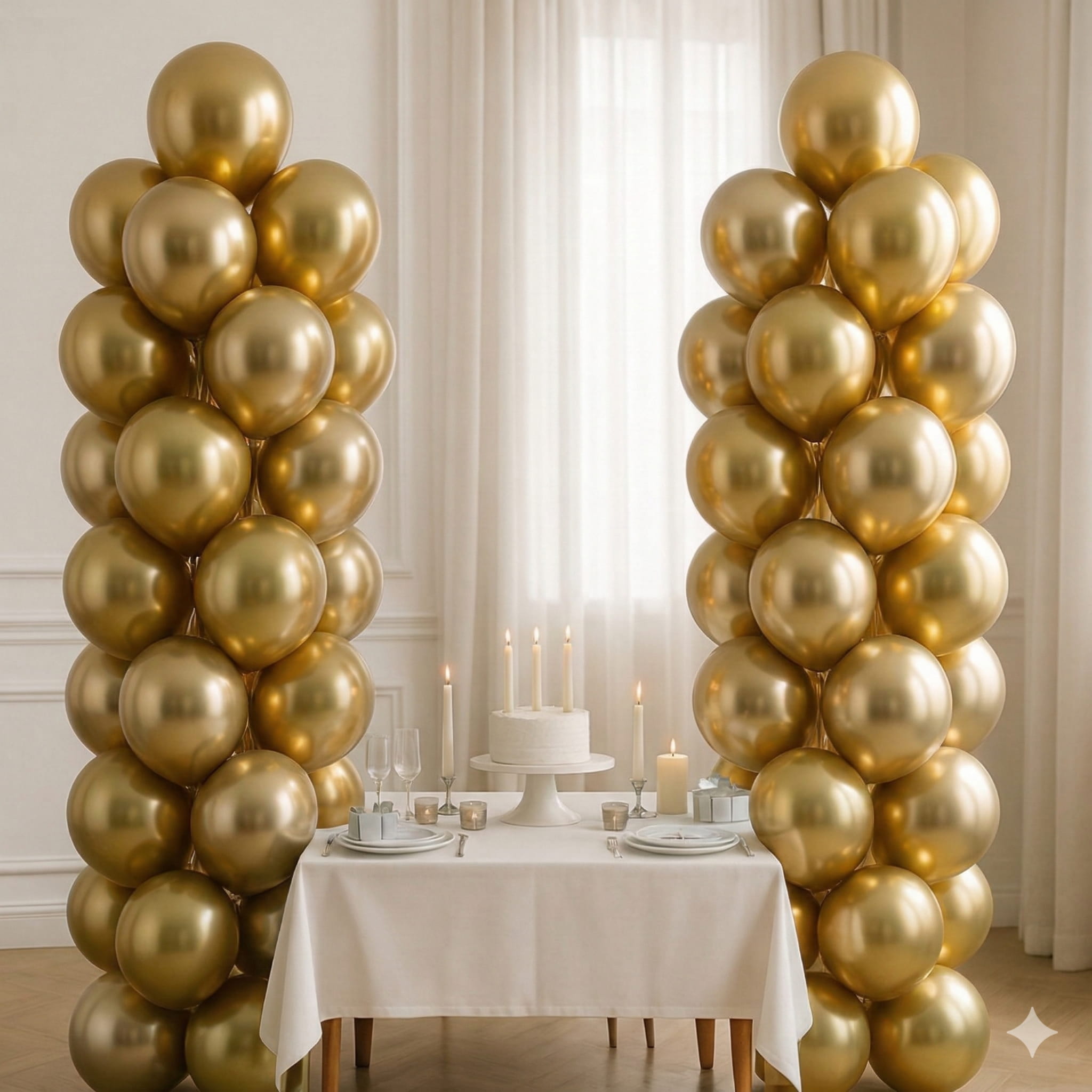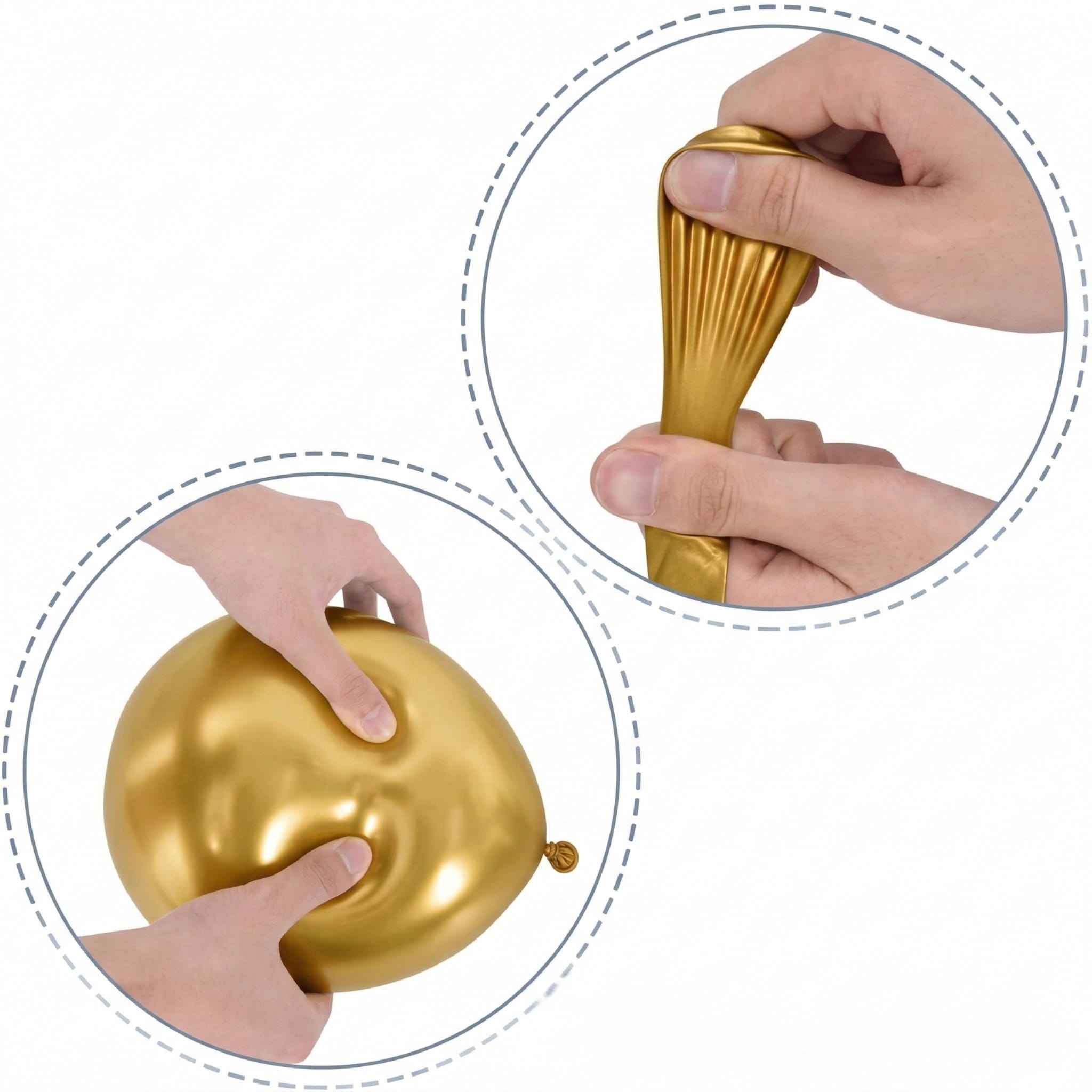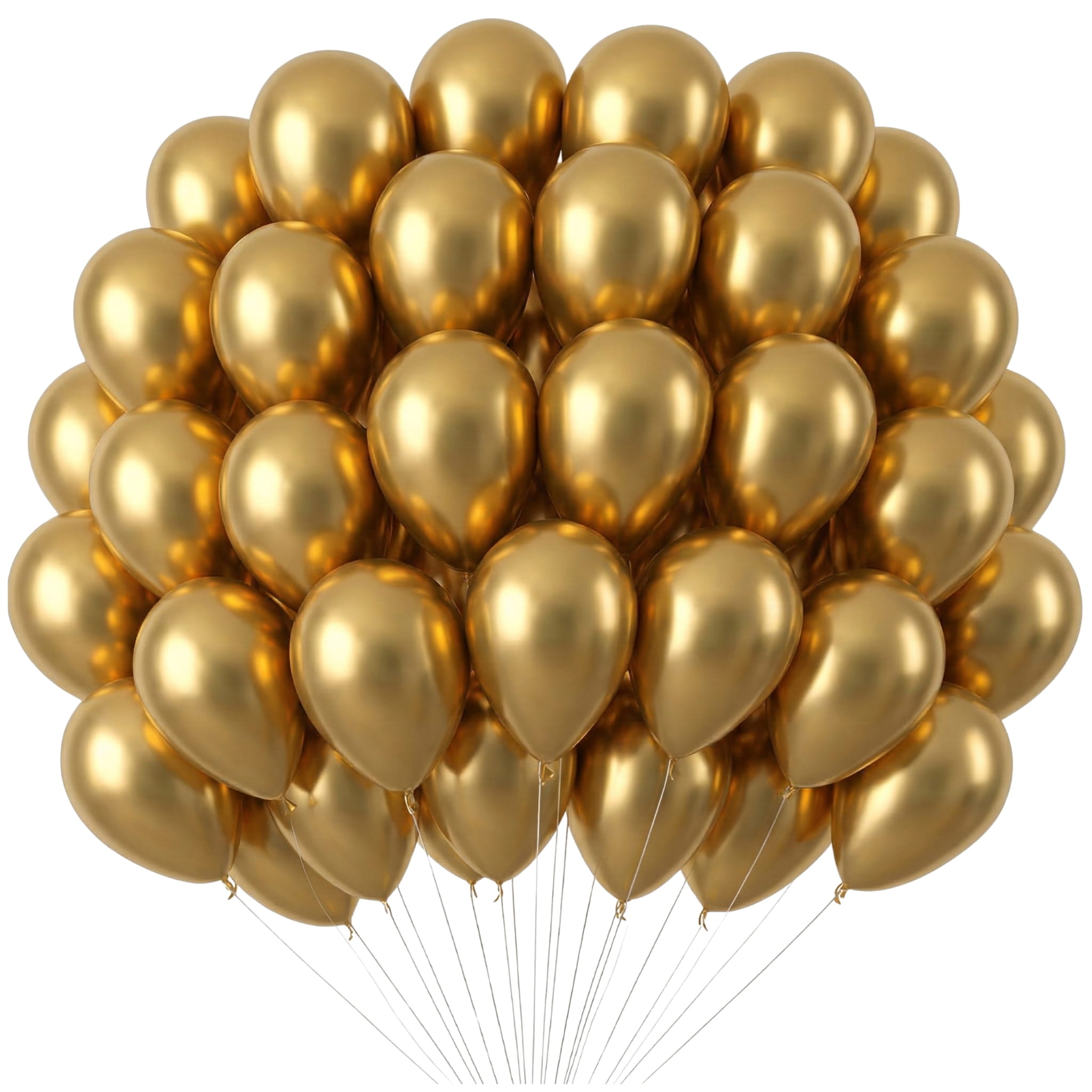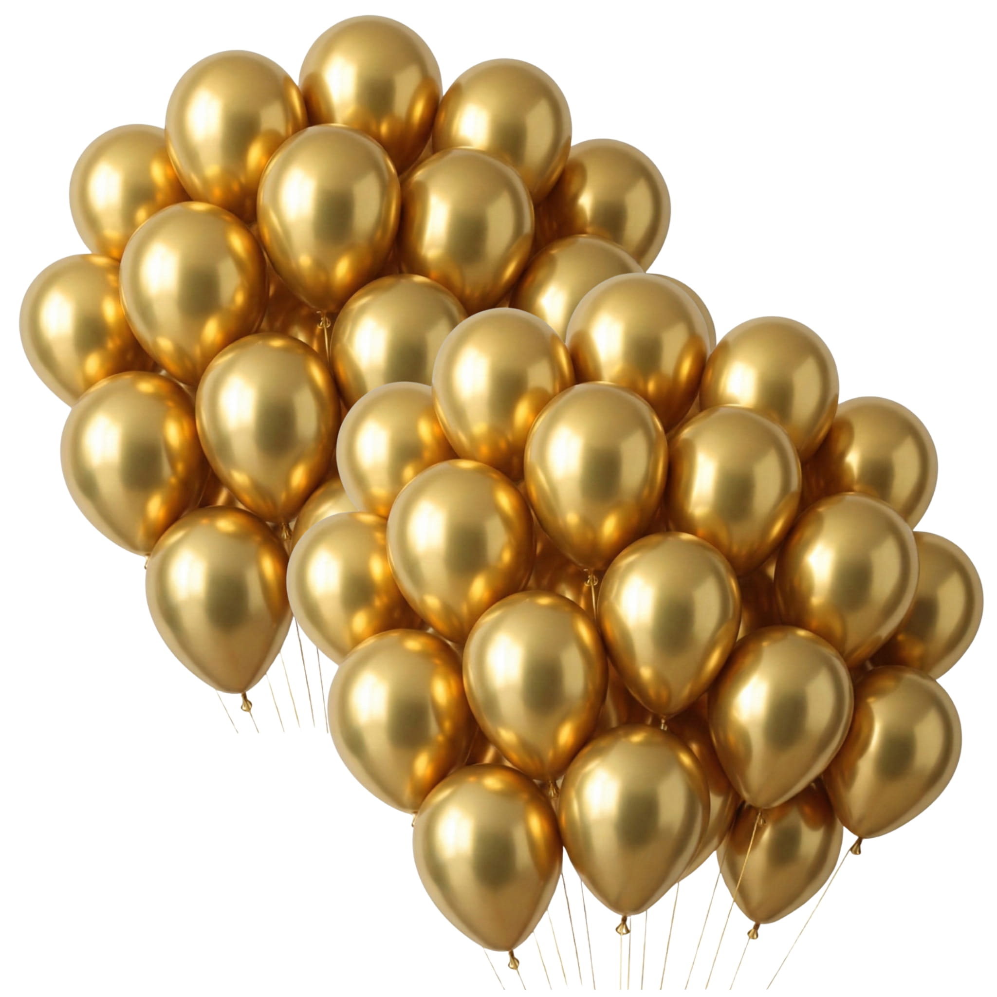Zestaw 100 złotych balonów lateksowych o wykończeniu chromowanym, rozmiar 10 cali (ok. 26 cm). Do napełniania powietrzem lub helem – do girland i dekoracji na komunię, chrzest, wesele oraz urodziny.