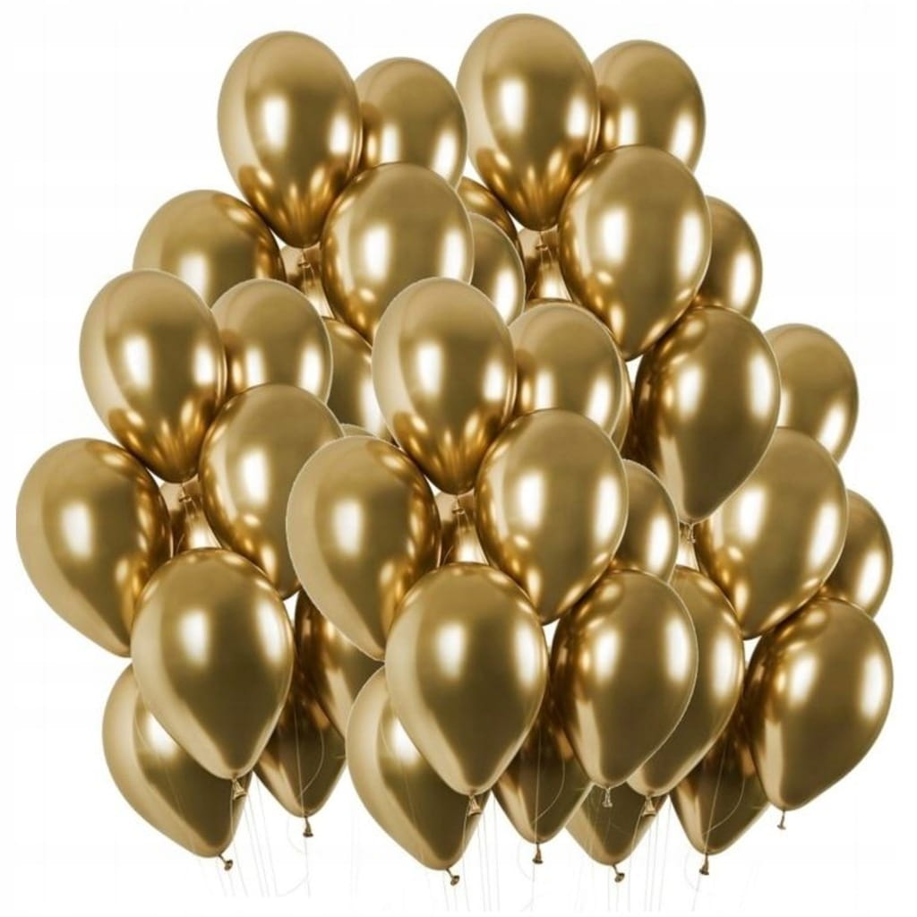 Zestaw 50 chromowanych balonów lateksowych Partivo w kolorze złotym o rozmiarze 30,5 cm. Nadają się do napełniania powietrzem lub helem i świetnie sprawdzą się w dekoracjach urodzinowych, weselnych oraz w aranżacjach glamour.