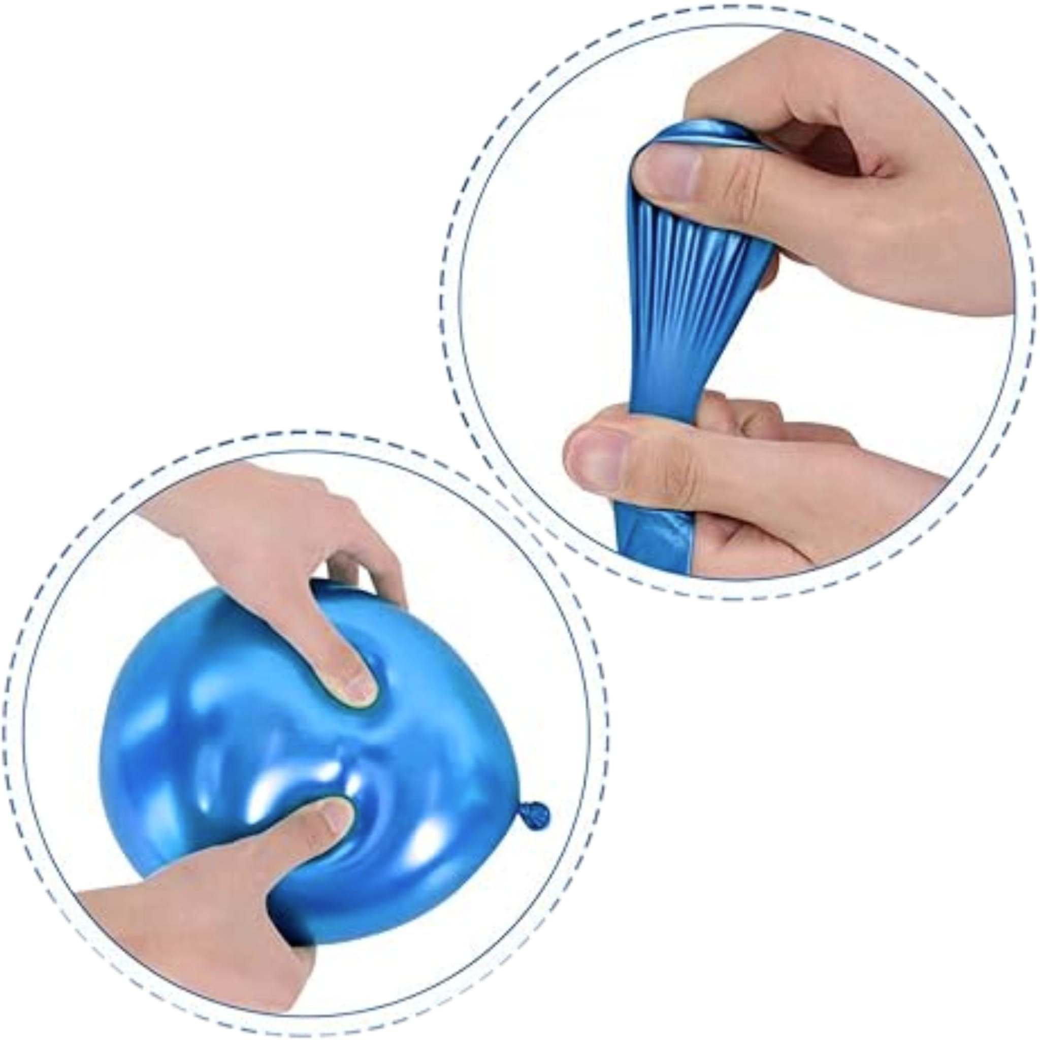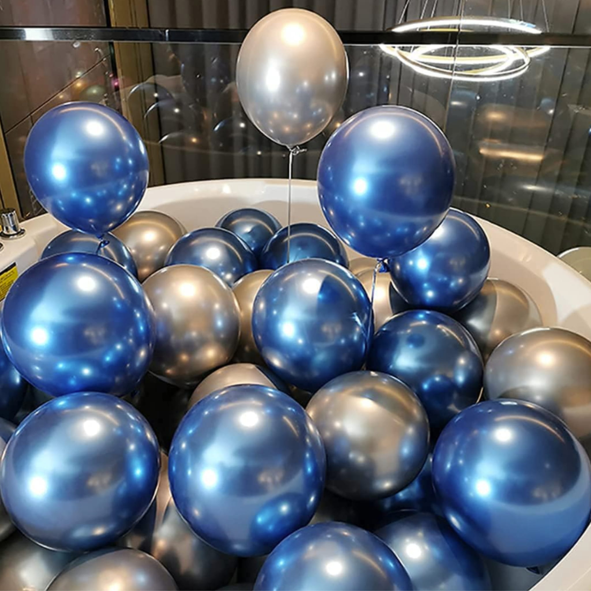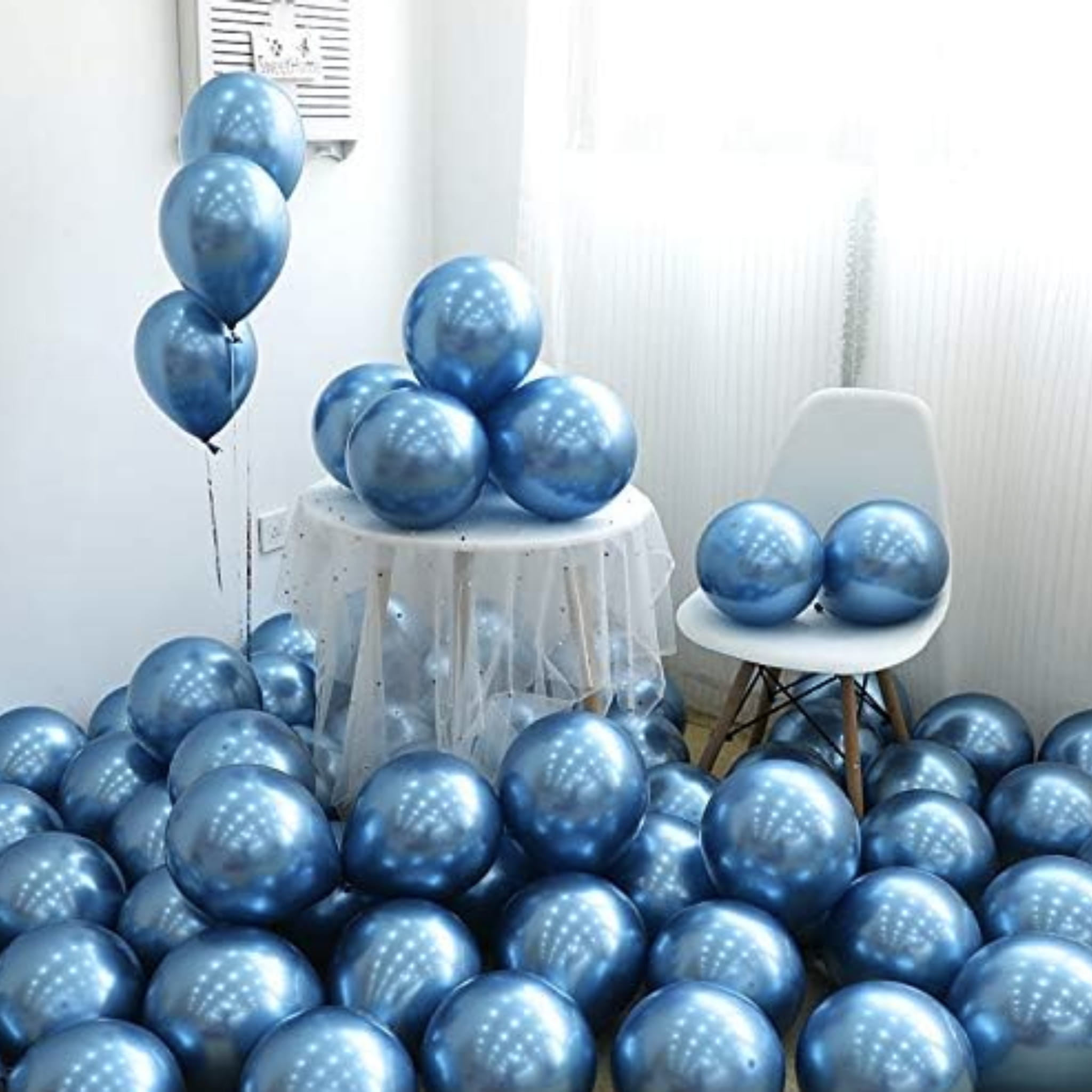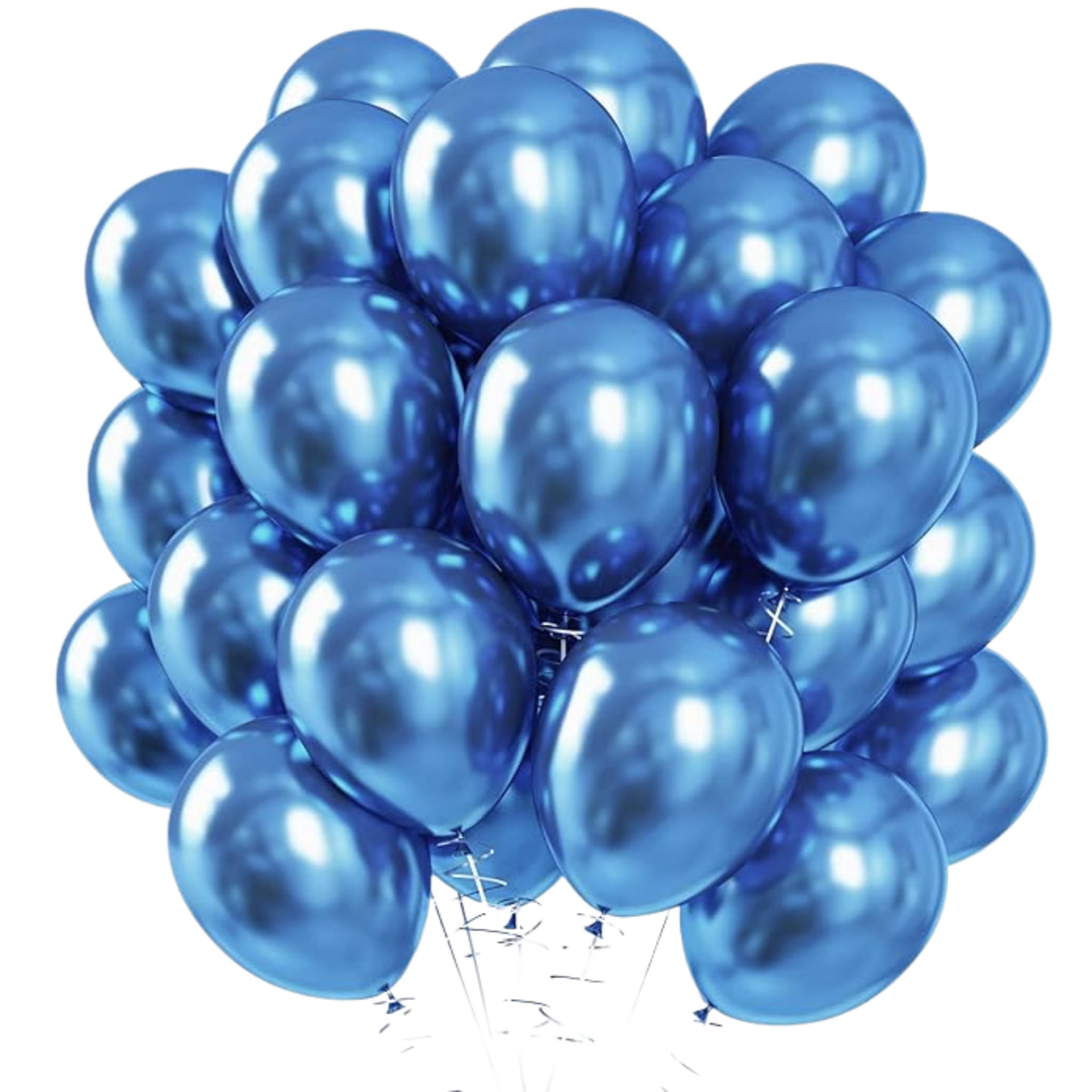Zestaw 50 balonów lateksowych w kolorze niebieskim z chromowanym wykończeniem. Rozmiar 12 cali / ok. 30,5 cm po napompowaniu. Do napełniania powietrzem lub helem.