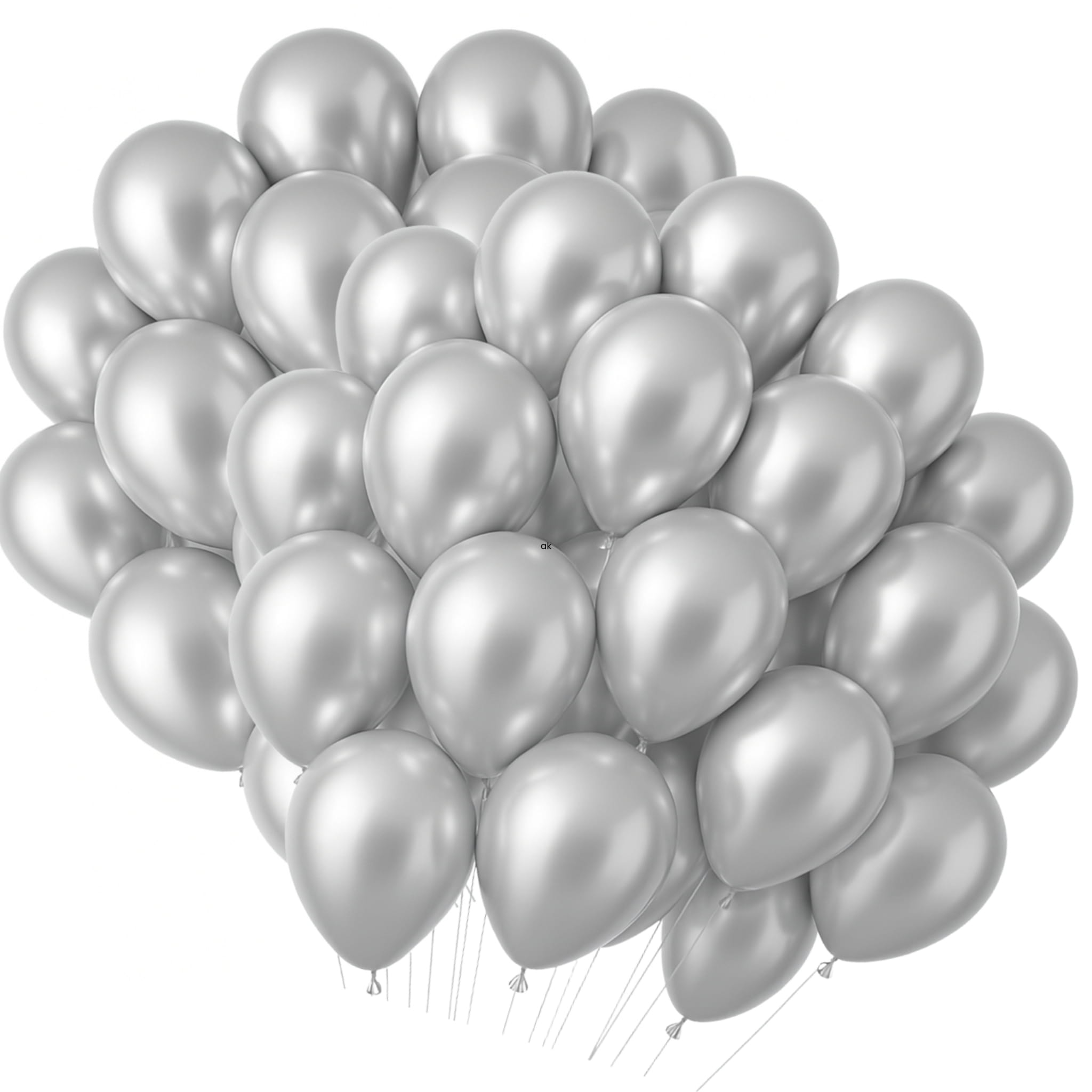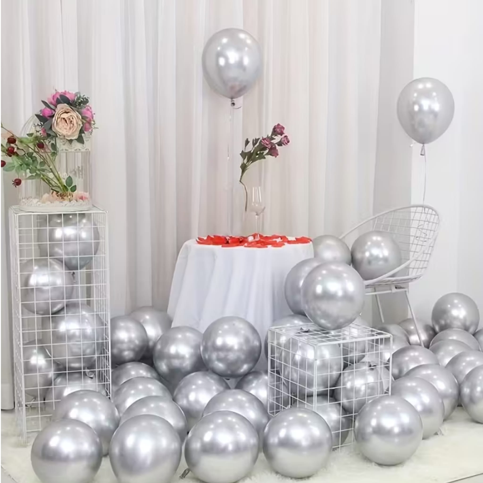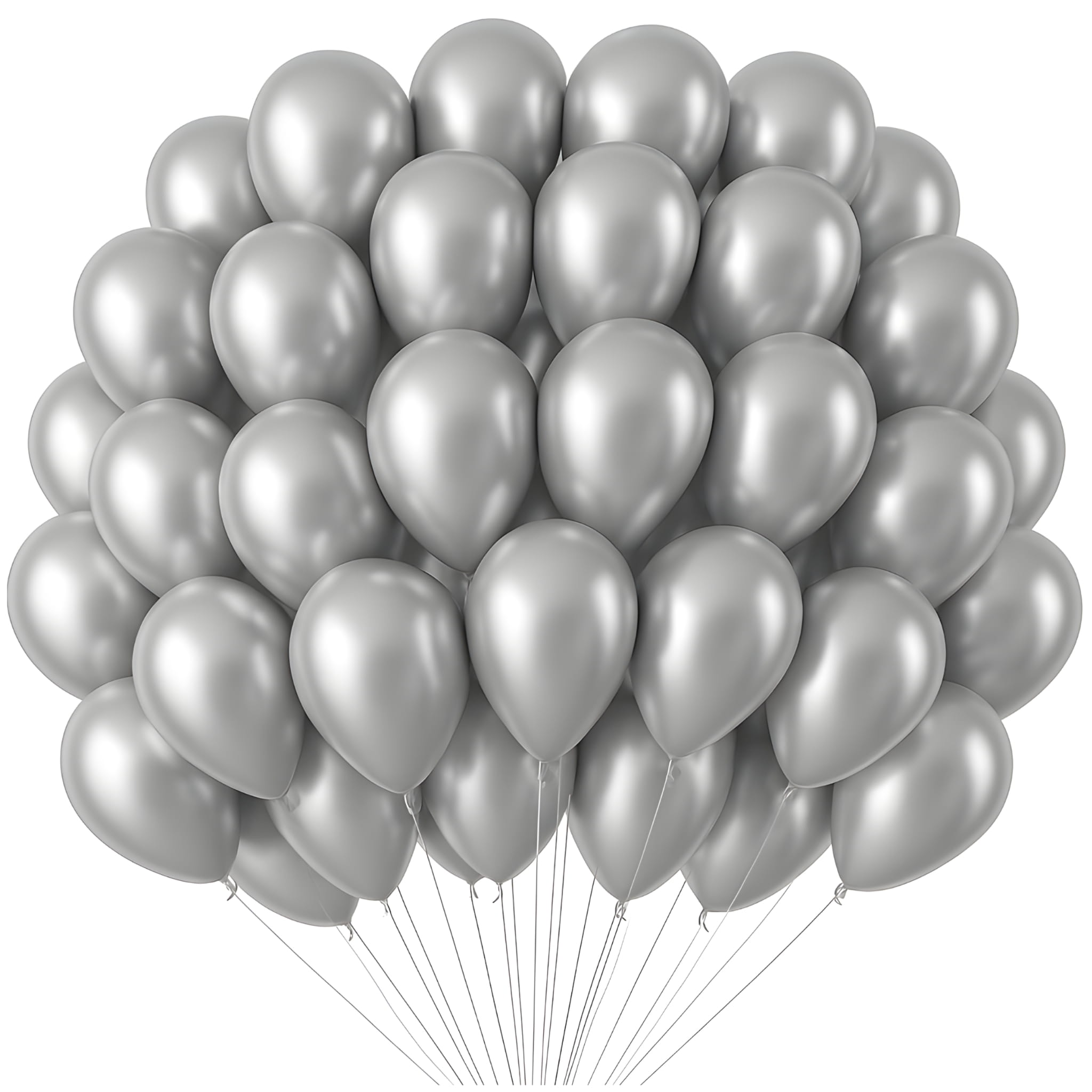 Zestaw 100 srebrnych balonów lateksowych chromowanych o średnicy 30,5 cm (12 cali). Do napełniania powietrzem lub helem – świetne do girland, łuków i dekoracji urodzinowych.
