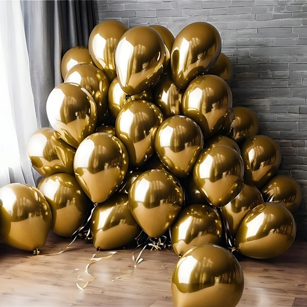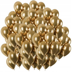 Zestaw 100 balonów lateksowych w kolorze złotym z chromowanym wykończeniem. Rozmiar 12 cali / ok. 30,5 cm po napompowaniu. Do napełniania powietrzem lub helem.