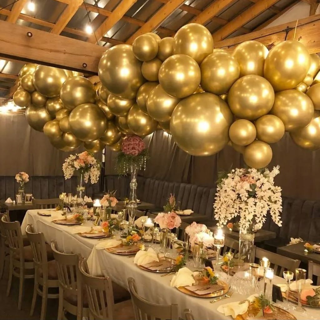 Złote balony chromowane to efektowna baza do dekoracji w stylu glamour, na urodziny, komunię i przyjęcia rodzinne. W zestawie znajduje się 100 balonów lateksowych w rozmiarze 12 cali (ok. 30,5 cm), co ułatwia przygotowanie większych kompozycji bez dobierania kilku paczek. Chromowane wykończenie daje wyraźny połysk i dobrze odbija światło, dzięki czemu dekoracja jest bardziej widoczna na zdjęciach. Balony można napełniać powietrzem lub helem, zależnie od planowanego efektu.