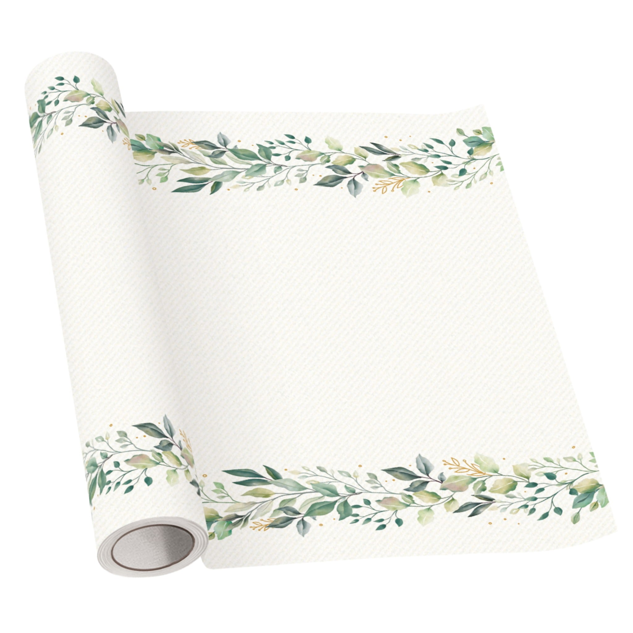 Bieżnik flizelinowy z motywem eukaliptusa w biało-zielonej kolorystyce. Wymiary 40 x 500 cm sprawdzą się jako dekoracja stołu na Pierwszą Komunię lub chrzest.