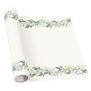 Bieżnik flizelinowy z delikatnym motywem zielonych listków eukaliptusa to prosty sposób na uporządkowanie aranżacji stołu. Biało-zielona kolorystyka dobrze łączy się z białym obrusem i naturalnymi dodatkami, wpisując się w styl boho oraz rustykalny. Rozmiar 40 x 500 cm pozwala dopasować dekorację do różnych długości stołu. Bieżnik można ułożyć centralnie jako wyraźny akcent lub wykorzystać jako tło pod zastawę i dekoracje. Sprawdzi się podczas przyjęć rodzinnych, w tym komunijnych i z okazji chrztu.