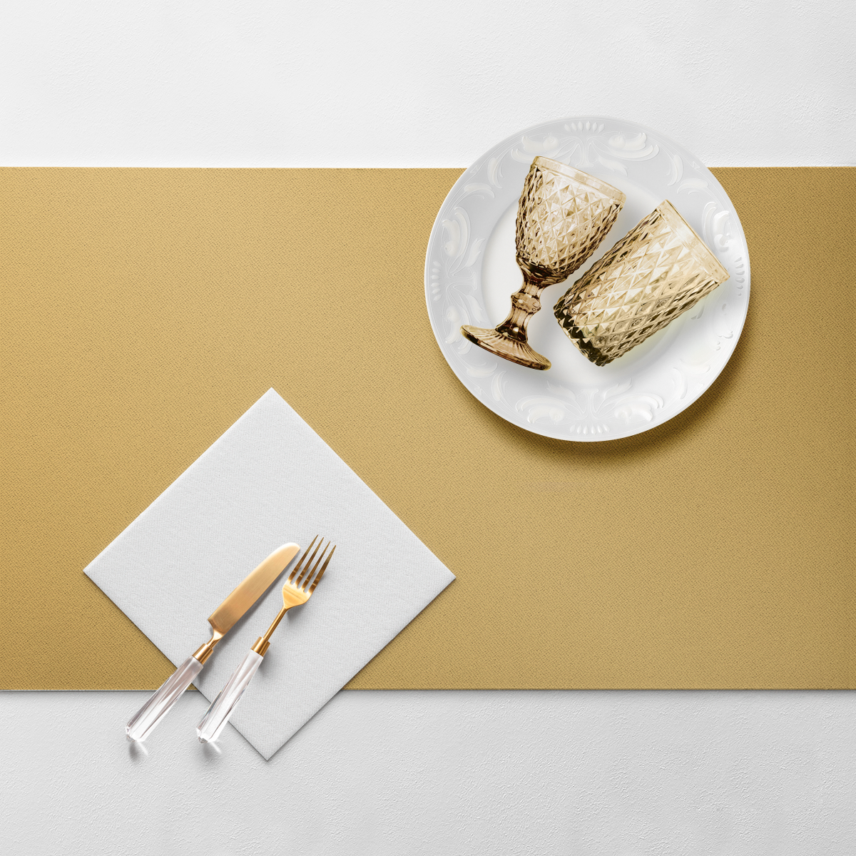 Złoty bieżnik flizelinowy Airlaid to prosty sposób na uporządkowaną, elegancką aranżację stołu. Struktura materiału przypomina tkaninę, dzięki czemu bieżnik wygląda estetycznie na białym obrusie lub bezpośrednio na blacie.