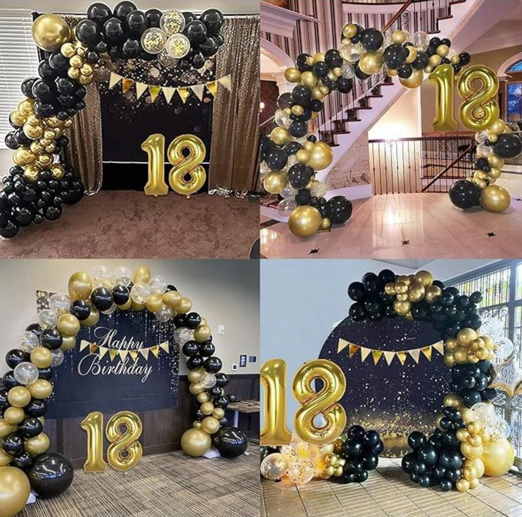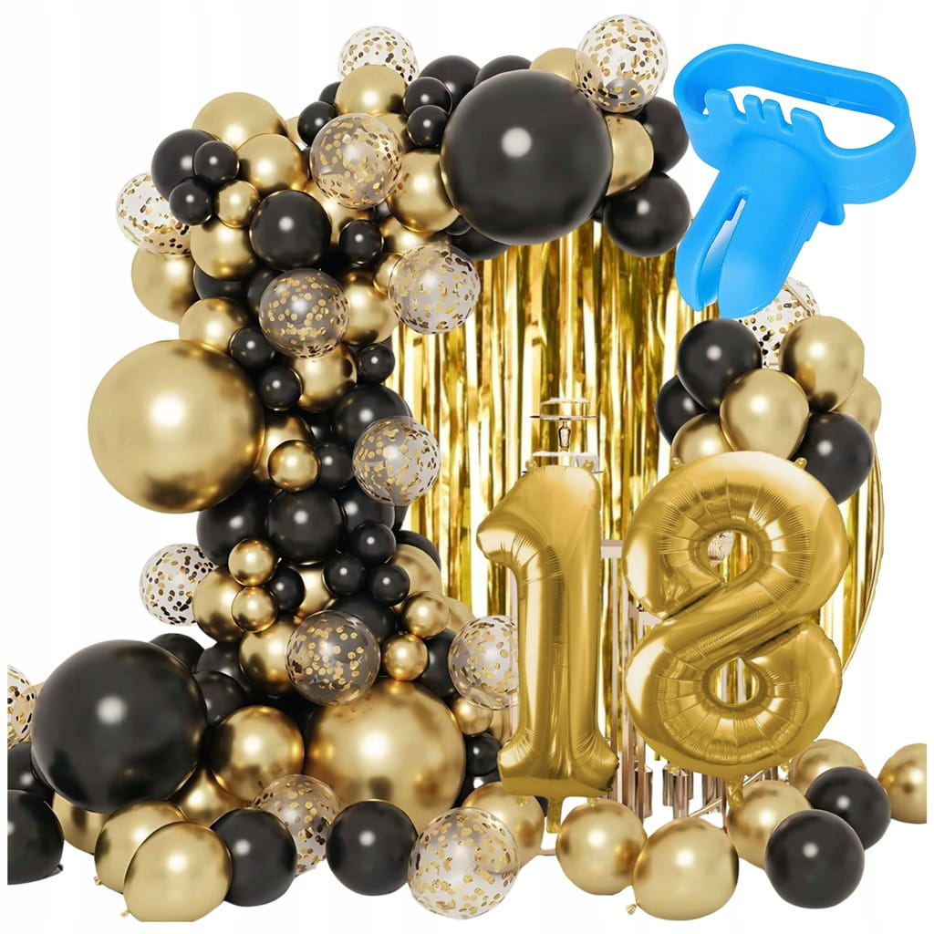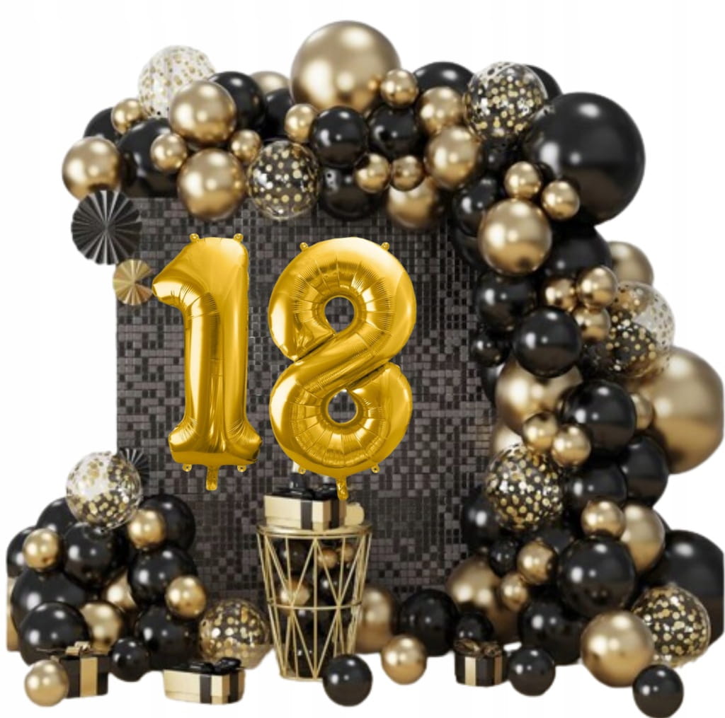 Jeśli chcesz szybko przygotować spójną dekorację w czerni i złocie, ten zestaw ułatwi Ci zadanie. Otrzymujesz komplet elementów do zrobienia girlandy balonowej w kilku rozmiarach, dzięki czemu dekoracja wygląda dynamicznie i dobrze prezentuje się na zdjęciach. W zestawie znajdziesz także akcesoria do montażu oraz złotą kurtynę, która świetnie sprawdza się jako tło. Do kompletu dołączone są 2 złote cyfry 81 cm, które pozwalają dopasować dekorację do wieku lub jubileuszu.