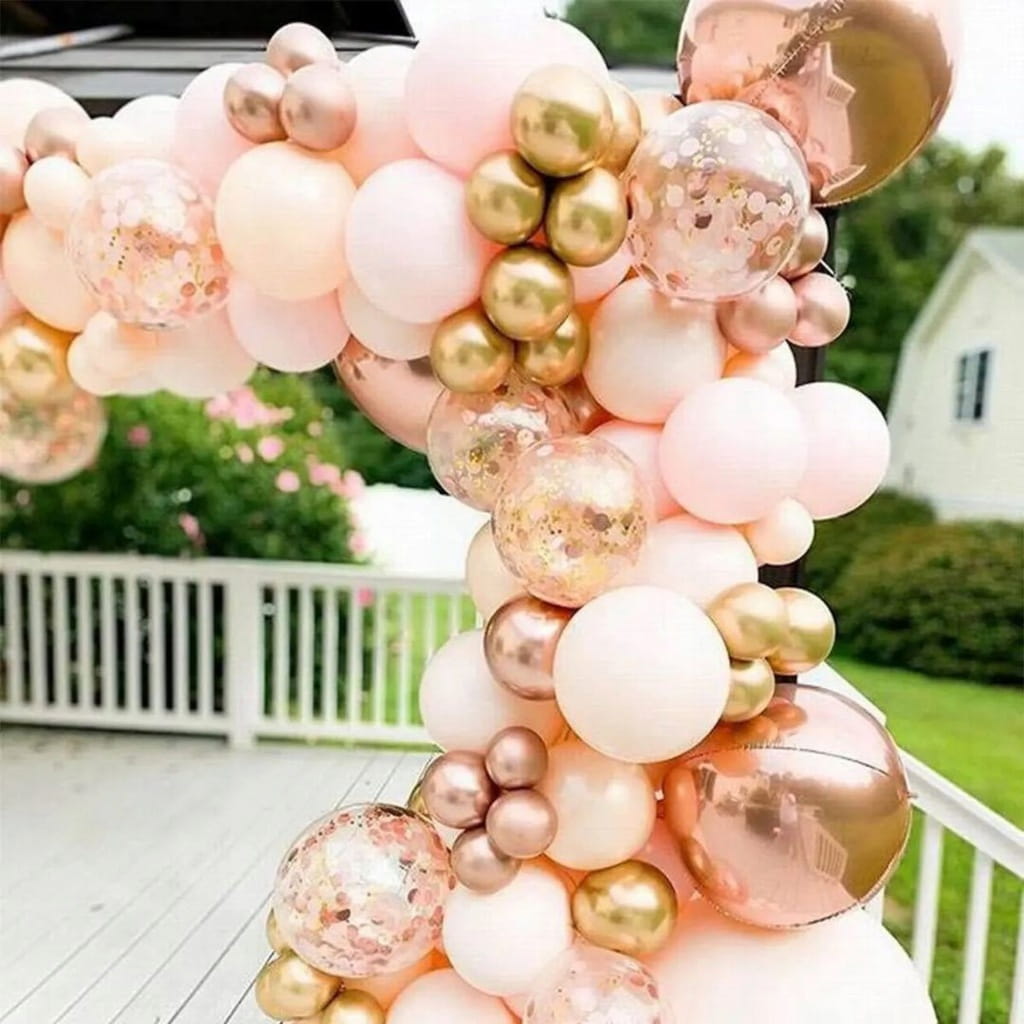 Zestaw girlandy balonowej Partivo w kolorystyce rose gold(96 elementów) z balonami konfetti, balonami foliowymi oraz dodatkami do montażu: taśma 5 m, kropki kleju i wiązadełko. Balony nadają się do napełniania powietrzem lub helem i sprawdzą się na urodziny, baby shower, wieczór panieński i wesele.