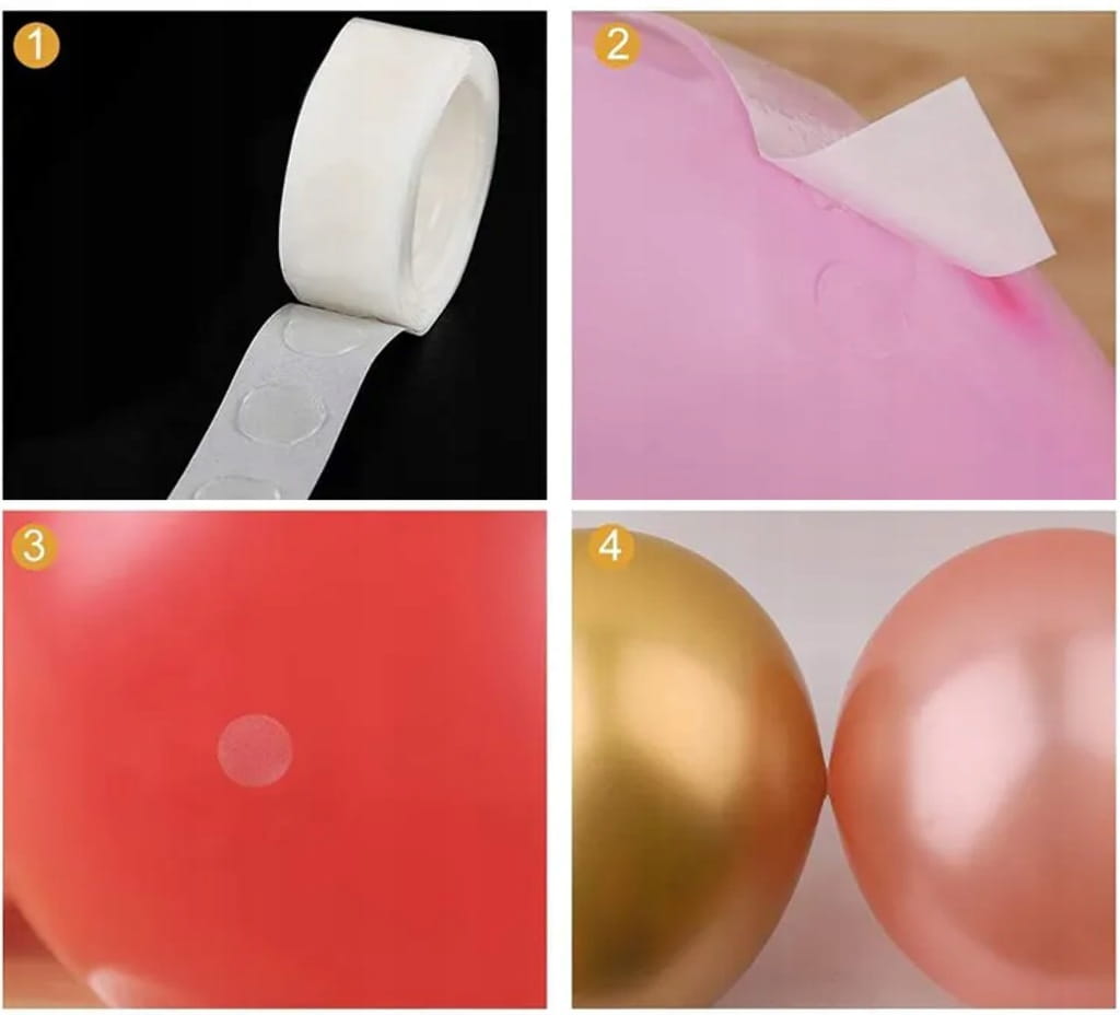 Odpowiedź: Balony w kilku rozmiarach (w tym foliowe rose gold i konfetti) oraz taśma do łączenia 5 m, kropki kleju i wiązadełko.
