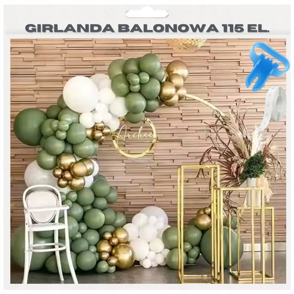 Odpowiedź: Balony w kolorach zielonym, białym i złotym chrom w kilku rozmiarach, taśma do łączenia balonów 5 m oraz kropki kleju.