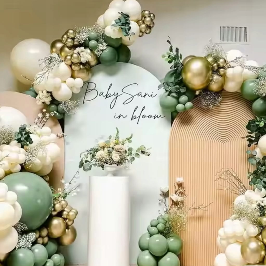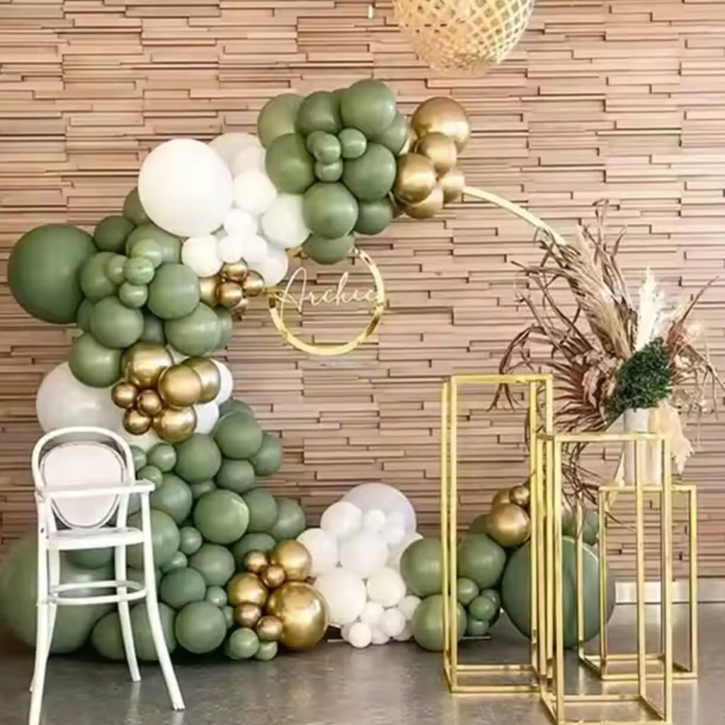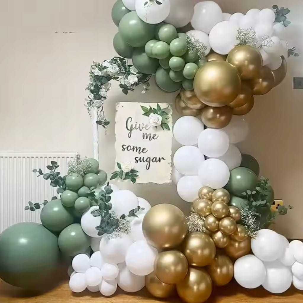 Kompletna girlanda balonowa Partivo w kolorach zielonym, białym i złotym chrom (117 elementów) z taśmą do łączenia 5 m oraz kropkami kleju. Zestaw sprawdzi się jako dekoracja ścianki, wejścia lub stołu na urodziny, wesele, komunię i inne przyjęcia.