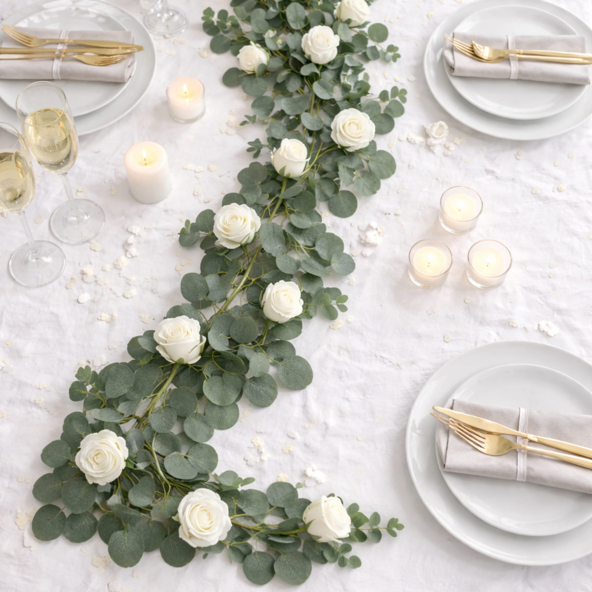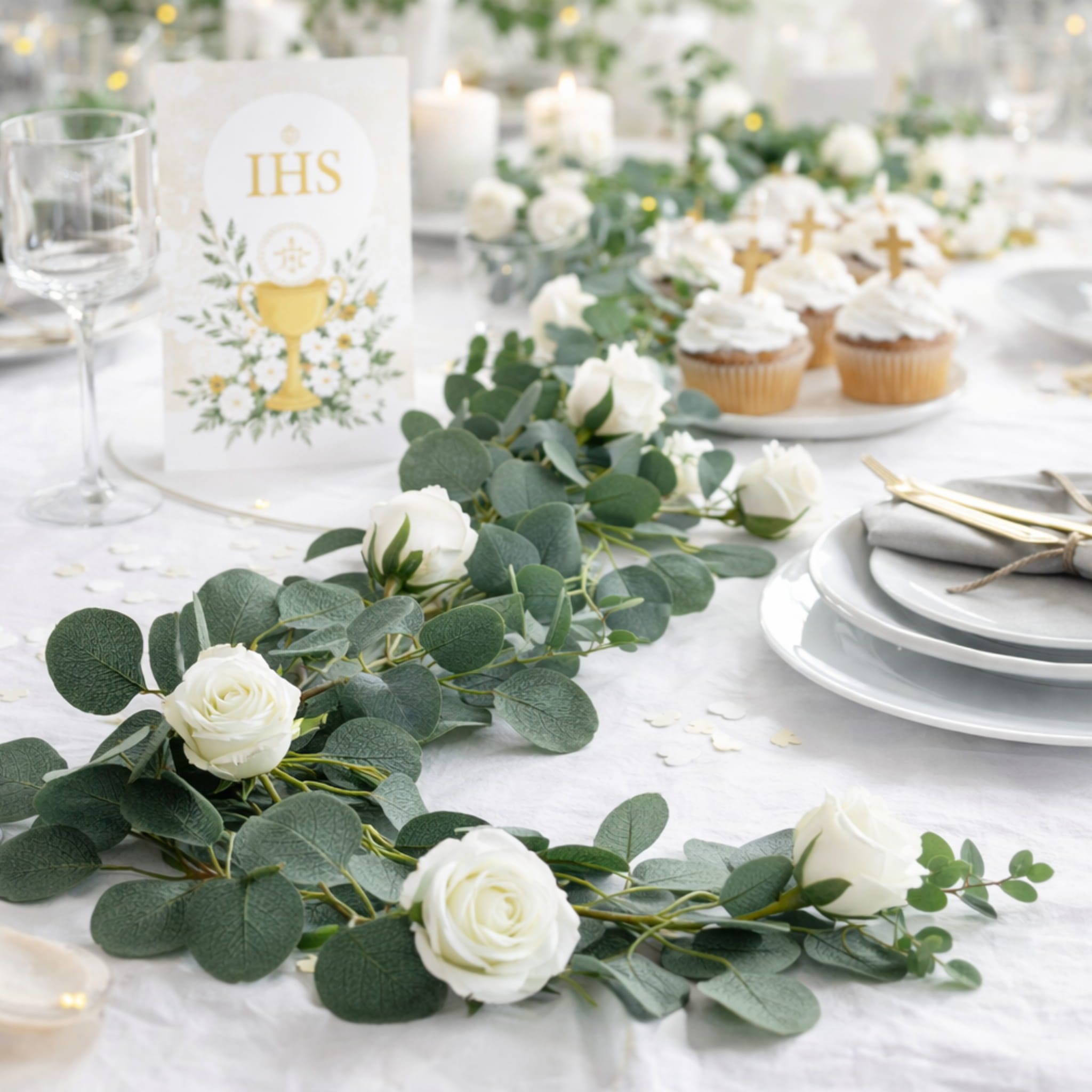 Sztuczna girlanda eukaliptusowa z białymi różami o długości ok. 190 cm. Zielono-biała kolorystyka pasuje na ślub, wesele i komunię — na stół, łuk, balustradę lub tło do zdjęć.