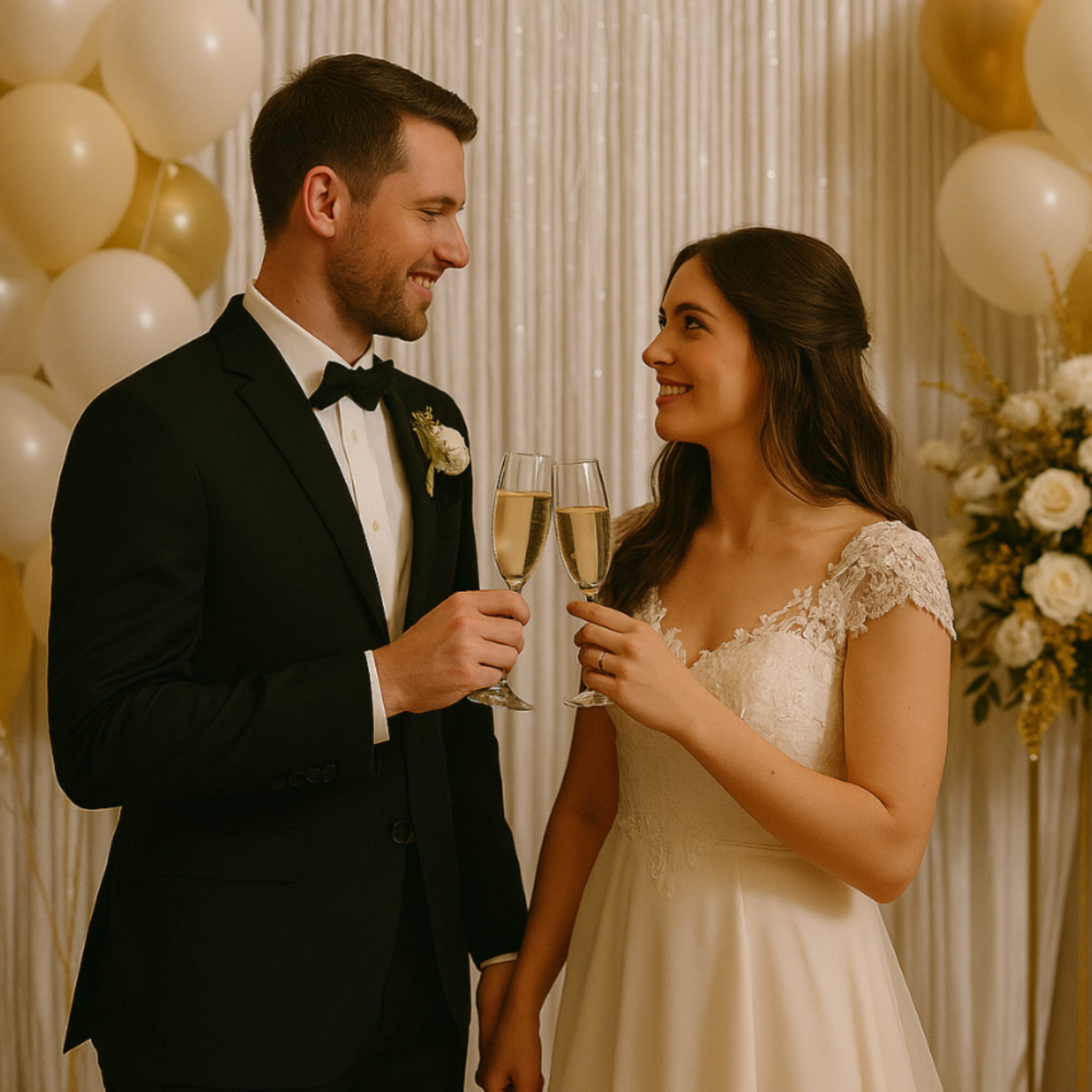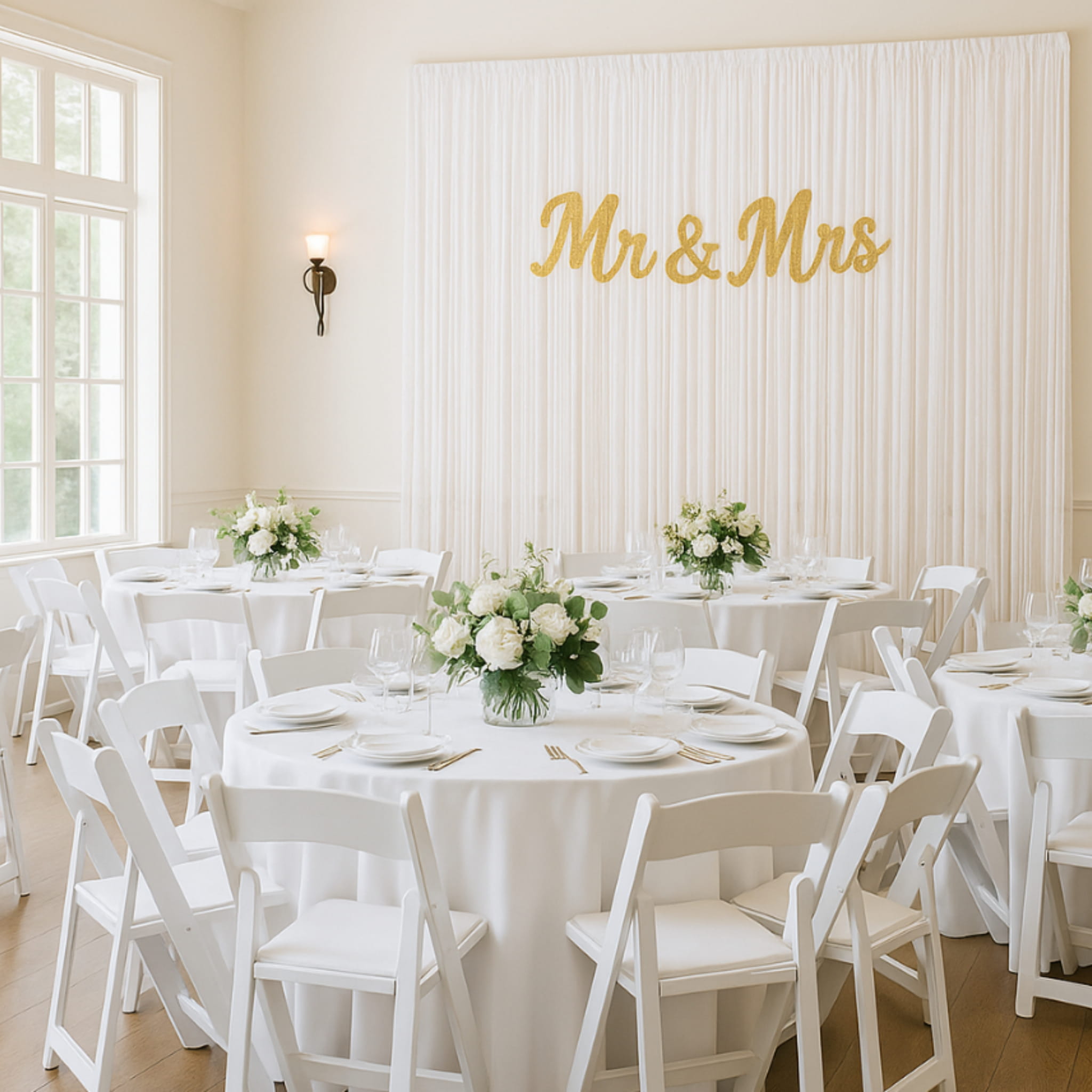 Wydziel strefę zdjęć w prosty sposób: zawieś białą kurtynę jako tło, a przed nią ustaw tabliczkę z napisem lub delikatne dodatki w tym samym kolorze. W aranżacjach ślubnych dobrze wygląda połączenie bieli z zielenią oraz ciepłym światłem, które podkreśla efekt na fotografiach. Jeśli planujesz sesję grupową, poszerz tło, łącząc dwie kurtyny obok siebie. Zobacz również pasujące dekoracje ślubne, aby zbudować spójny zestaw na ceremonię i przyjęcie.