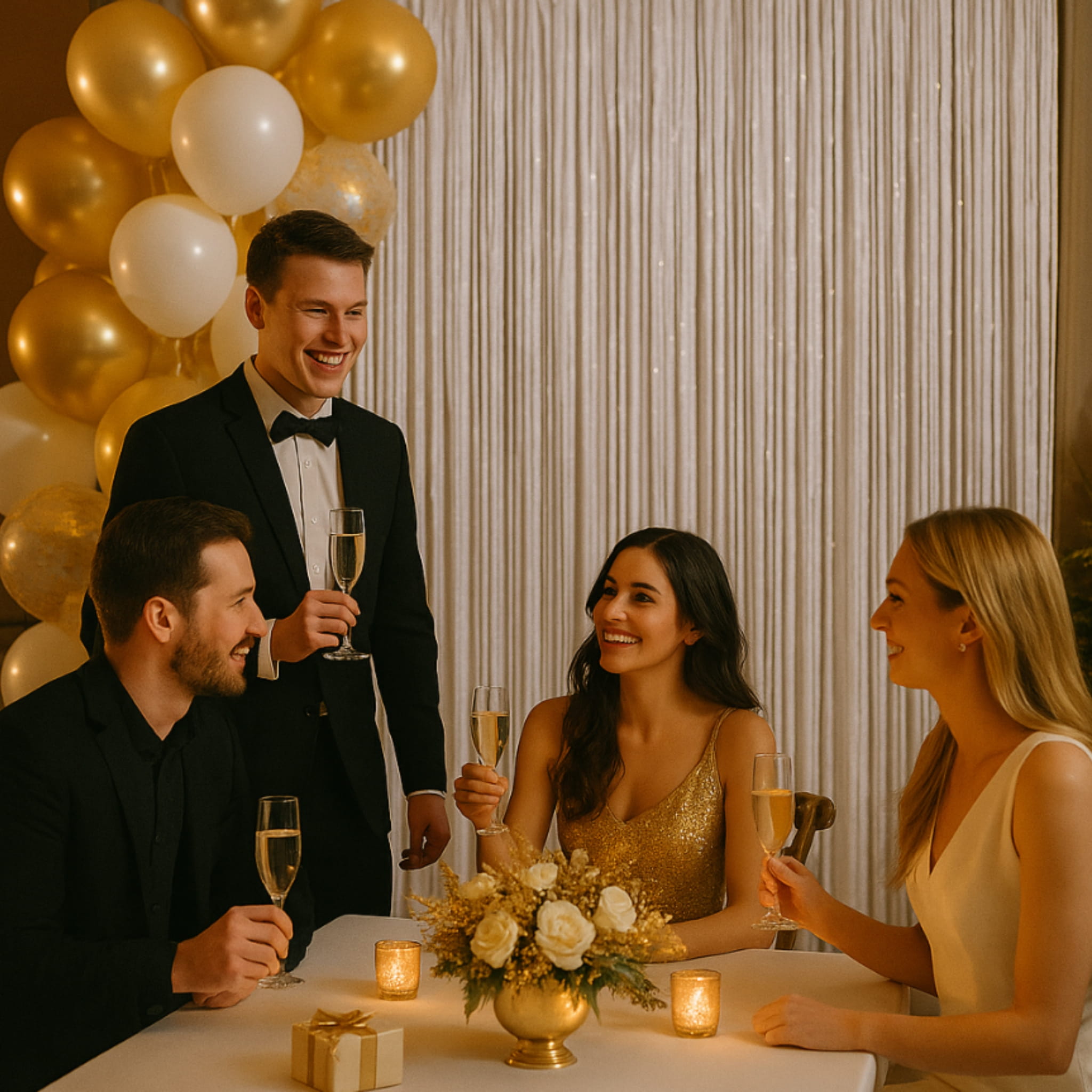 Biała kurtyna dekoracyjna w formacie 200 x 100 cm pozwala szybko stworzyć eleganckie tło do zdjęć oraz uporządkować strefę fotograficzną na przyjęciu. Jasna kolorystyka dobrze łączy się z dekoracjami ślubnymi i weselnymi, ale sprawdzi się też podczas urodzin, jubileuszu czy eventu firmowego. Kurtynę można wykorzystać jako tło do fotobudki, dekorację wejścia lub tło za stołem. Lekka konstrukcja ułatwia przygotowanie aranżacji na czas imprezy oraz wykonanie pamiątkowych zdjęć w spójnym stylu. Jeśli potrzebujesz szerszego tła, możesz zestawić kilka kurtyn obok siebie.