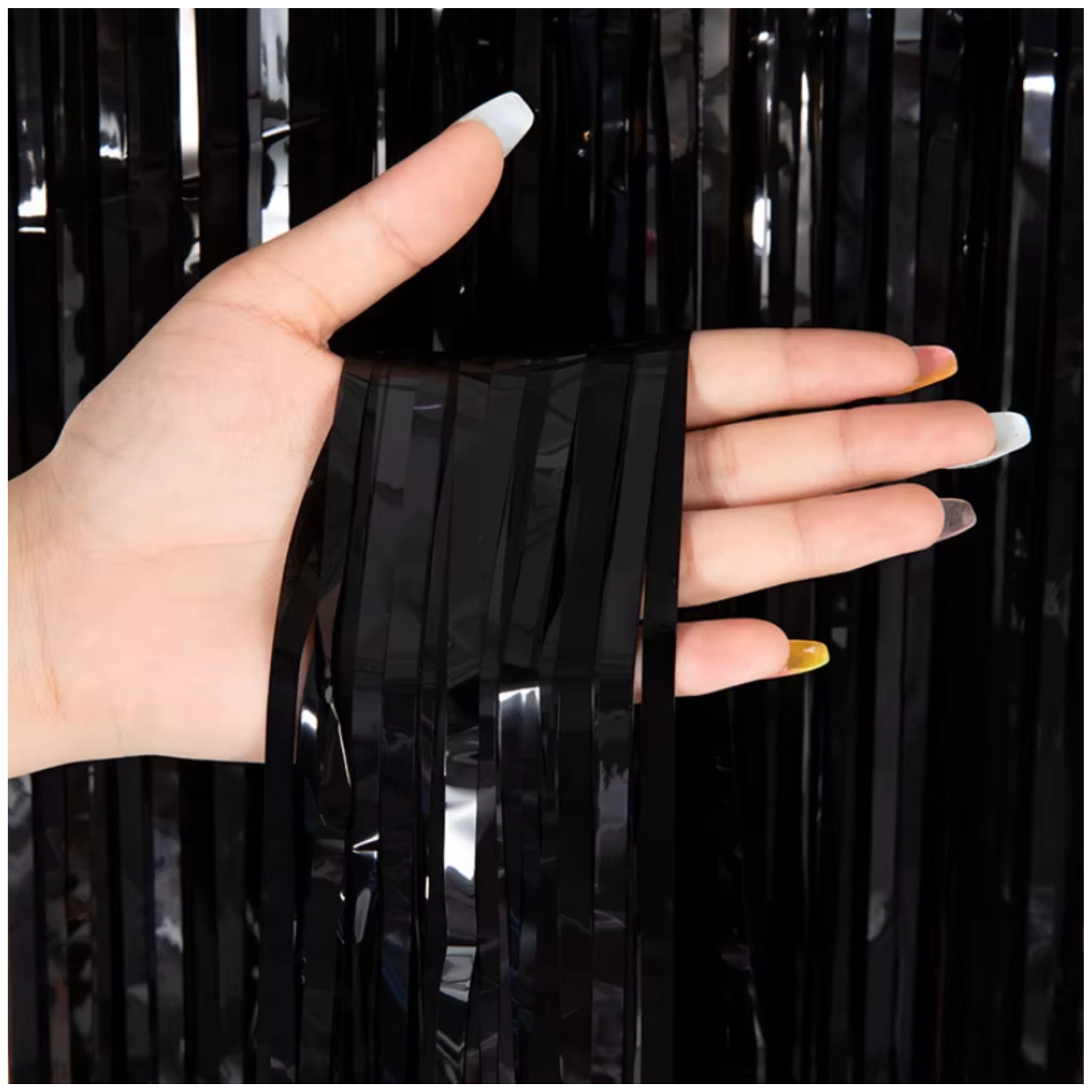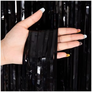 Czarna kurtyna dekoracyjna z metalicznej folii w rozmiarze 200x100 cm. Sprawdzi się jako tło do zdjęć, dekoracja ściany lub zasłona wejścia na imprezie. W opakowaniu 1 szt.