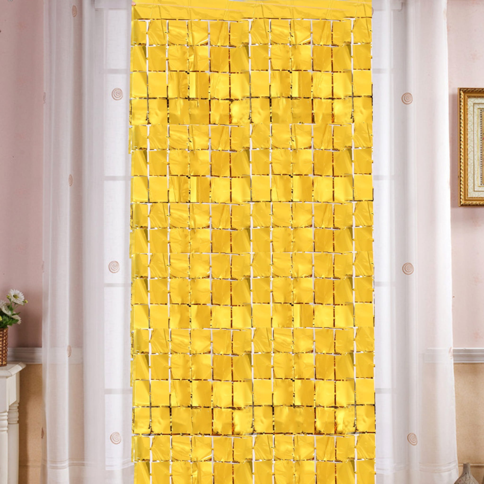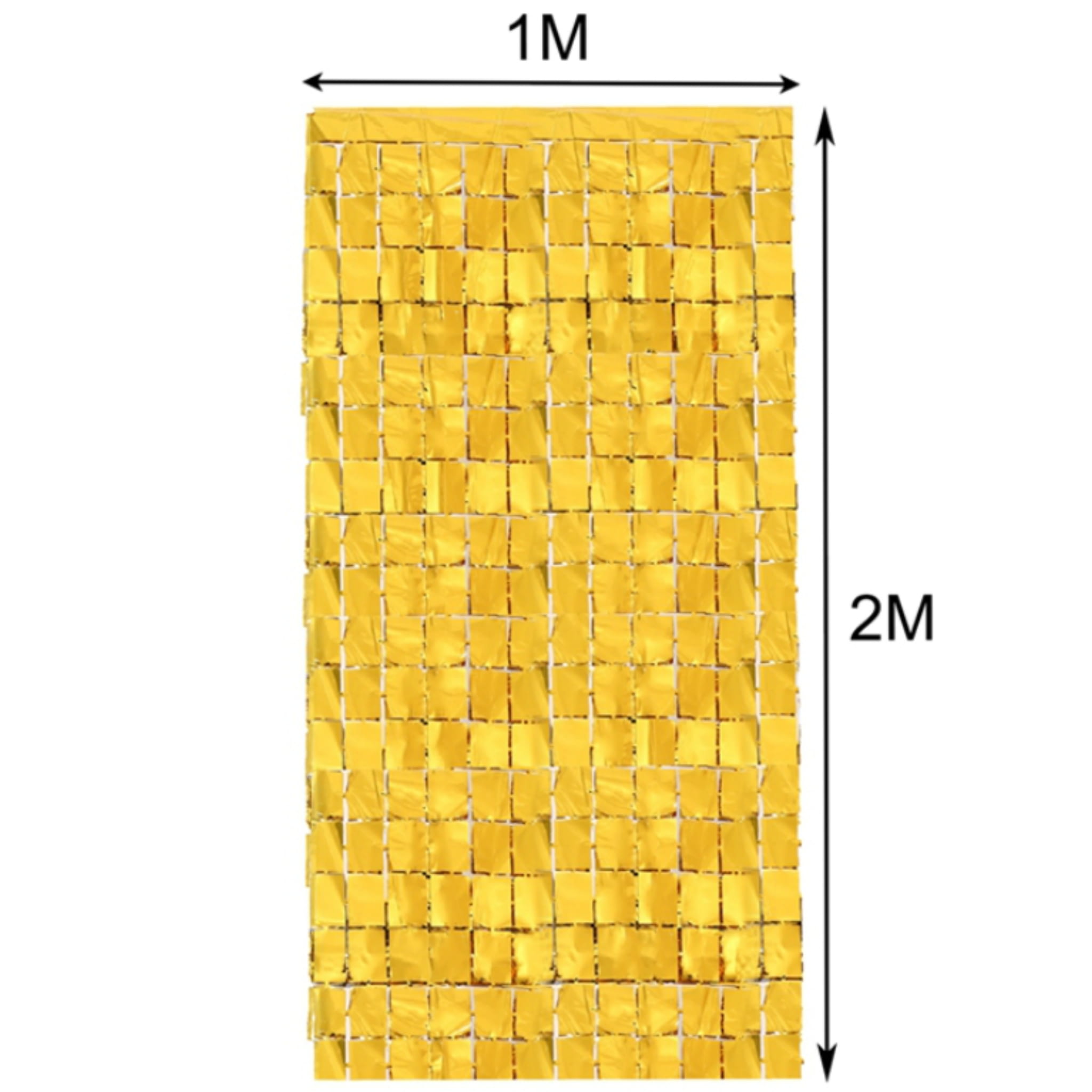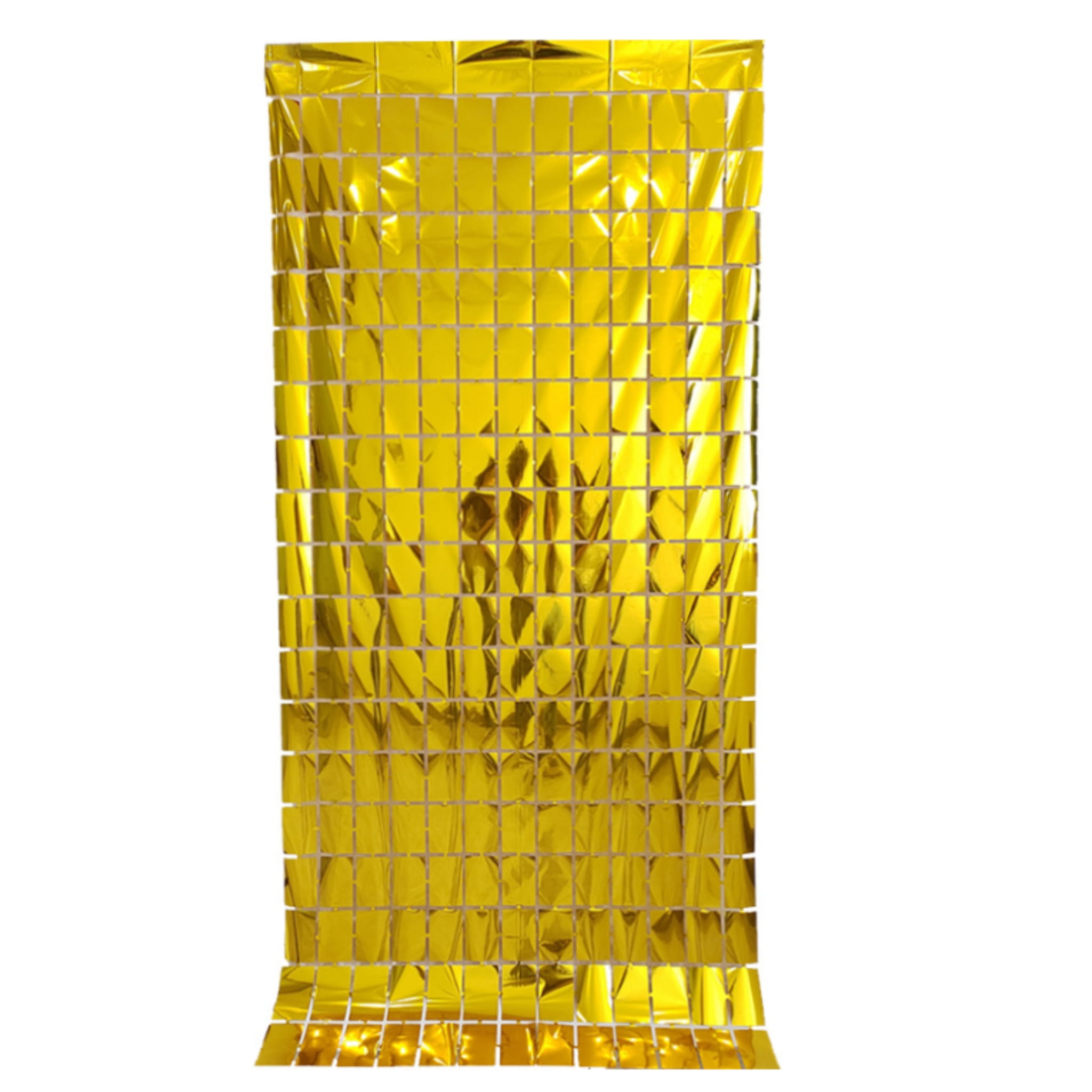 Złota, metaliczna kurtyna dekoracyjna z folii w rozmiarze 200x100 cm. Ma samoprzylepny pasek, więc łatwo przygotujesz tło do zdjęć lub dekorację ściany. W opakowaniu 1 szt.