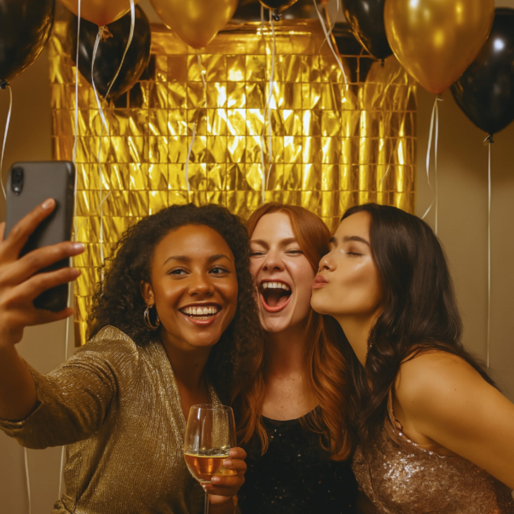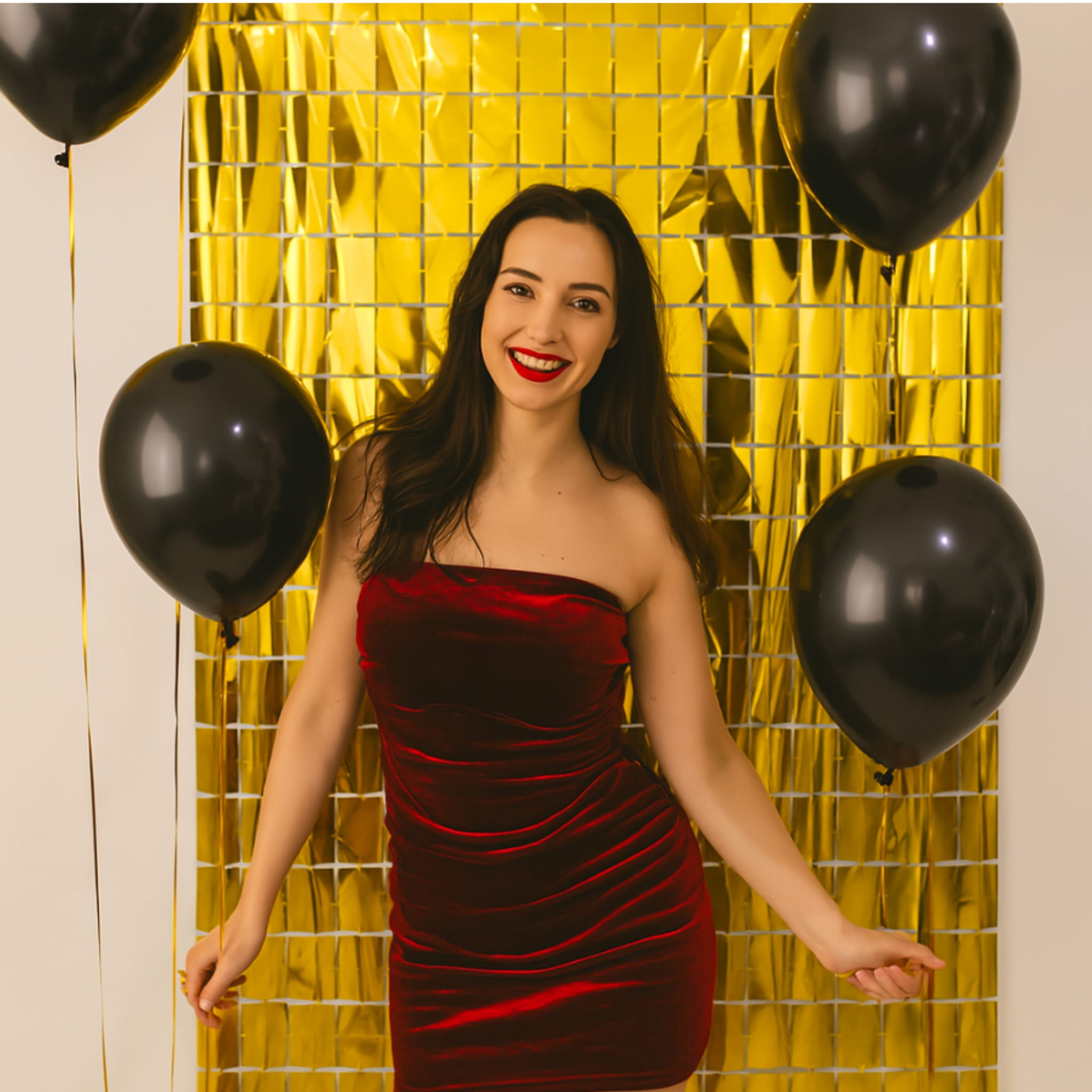 Ustaw kurtynę jako tło do zdjęć i dodaj po bokach kompozycję balonową w bieli lub czerni, aby podbić kontrast i połysk złota. Jeśli przygotowujesz strefę zdjęciową, dołóż punktowe światło skierowane na folię – efekt będzie bardziej widoczny na zdjęciach. Przy większej ściance możesz połączyć kilka kurtyn, aby uzyskać szersze tło. Zobacz też kurtyny dekoracyjne i dobierz warianty kolorystyczne do motywu imprezy.