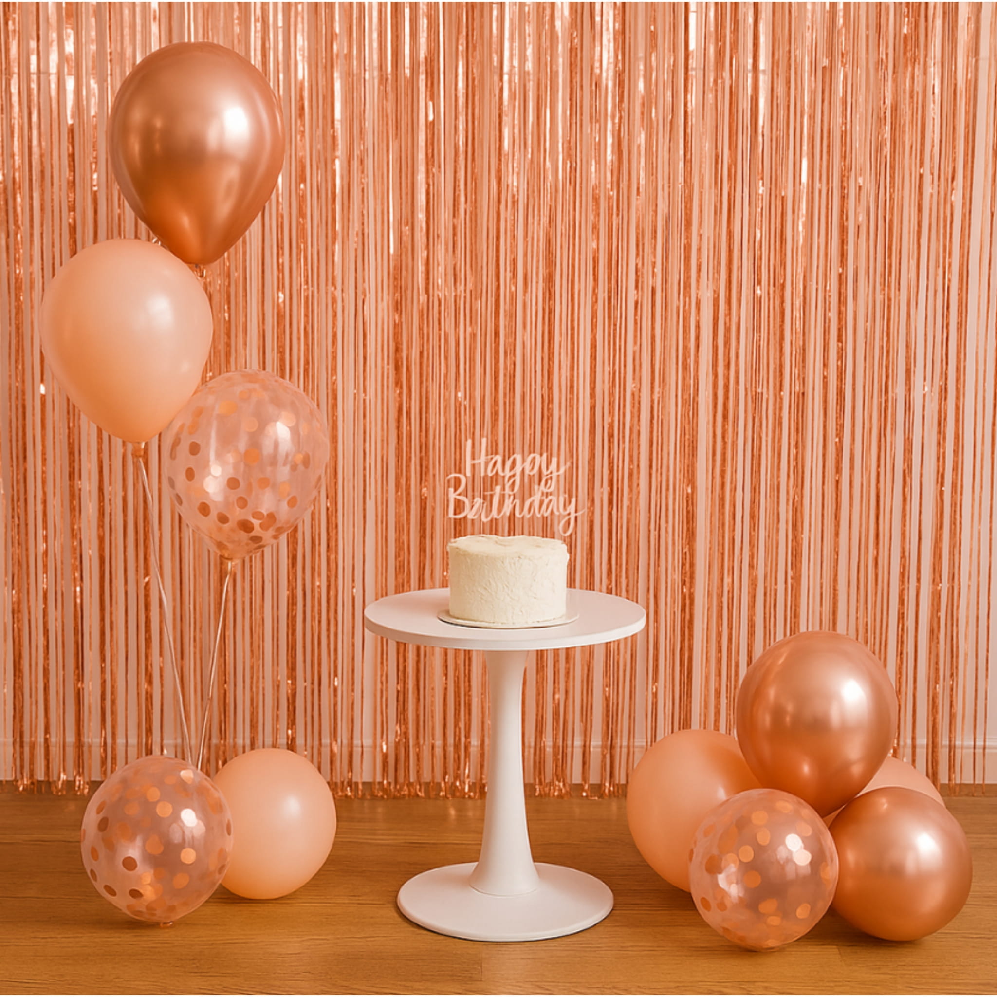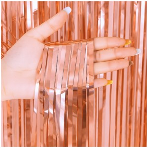 Kurtyna dekoracyjna w kolorze różowego złota o wymiarach 200 × 100 cm. Sprawdzi się jako tło do zdjęć, ścianka do fotobudki oraz element dekoracji sali na urodziny i przyjęcia.