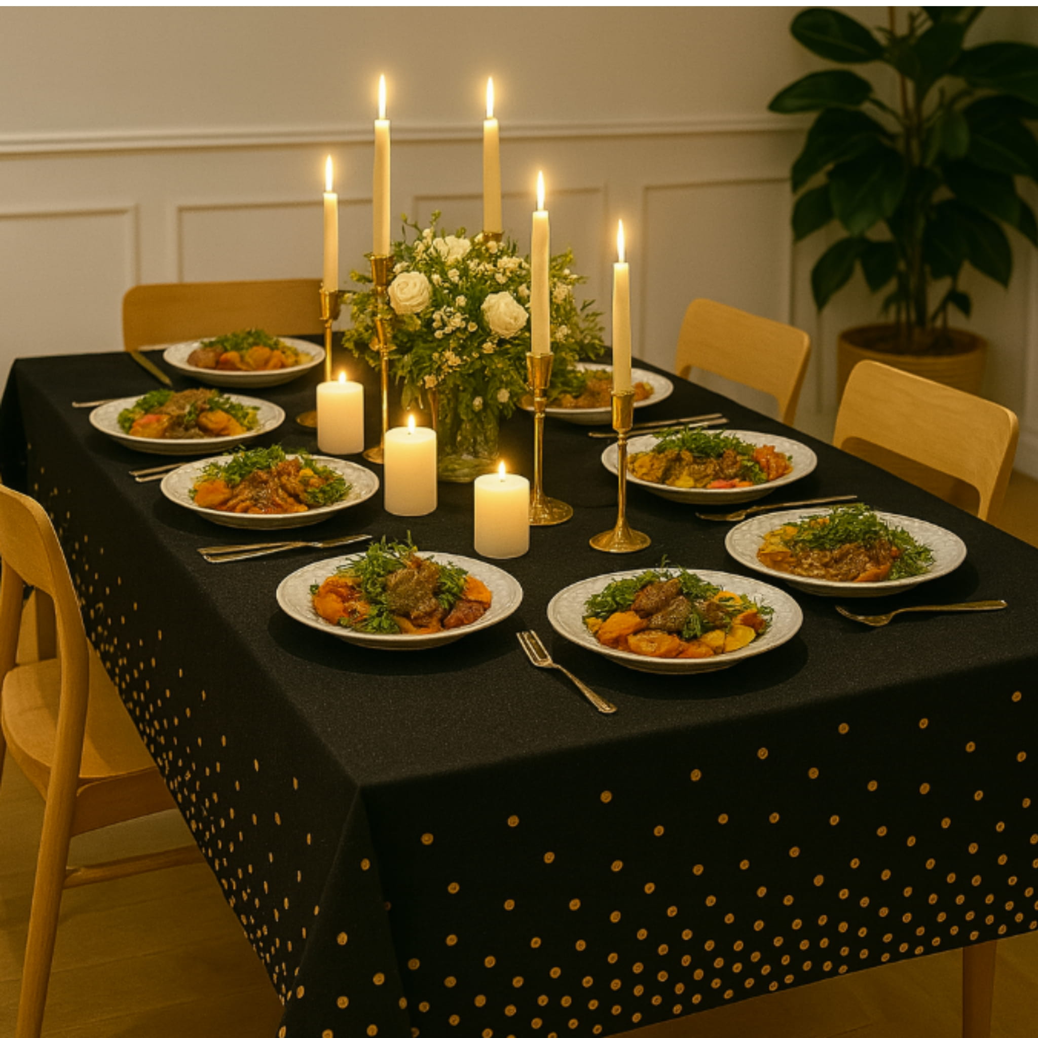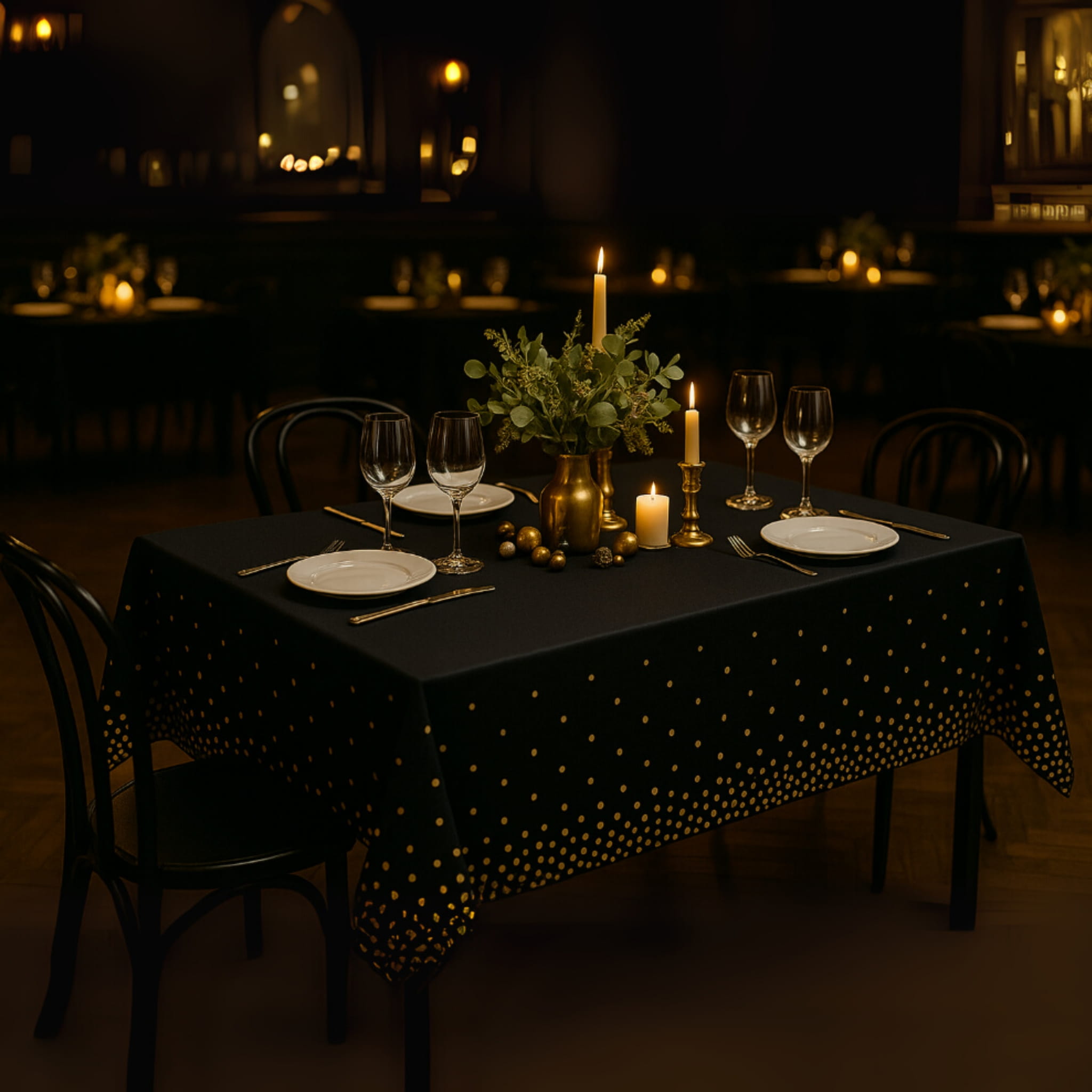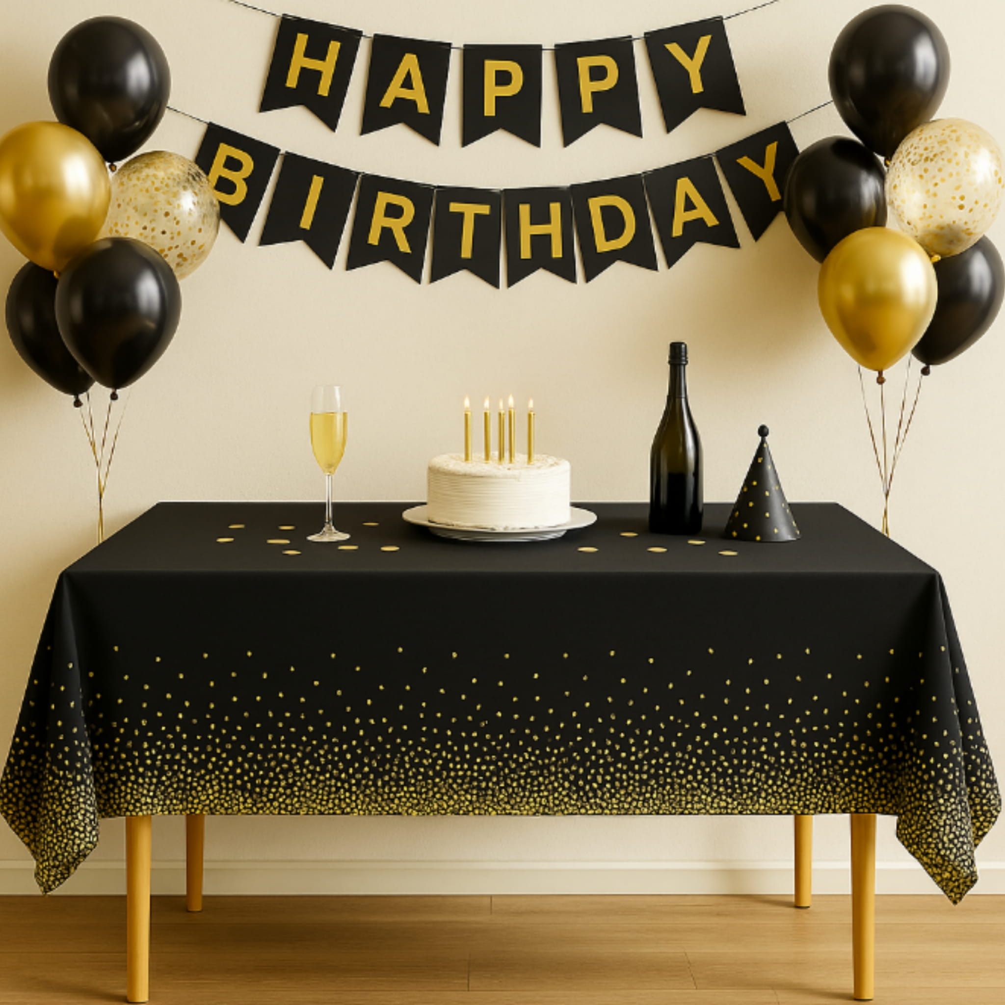 Zestaw obrus z czarnymi serwetkami i złotymi dodatkami, aby uzyskać spójny, wieczorowy efekt. Na środku stołu ułóż prostą dekorację z balonów lub świec w kolorach czarnym i złotym, a całość uzupełnij drobnymi konfetti. Przy większych przyjęciach wykorzystaj obrus jako bazę dla strefy napojów lub słodkiego stołu. Jeśli chcesz zachować minimalistyczny styl, postaw tylko na złote akcenty w zastawie. Zobacz pasujące dodatki w kategorii dekoracje stołu.