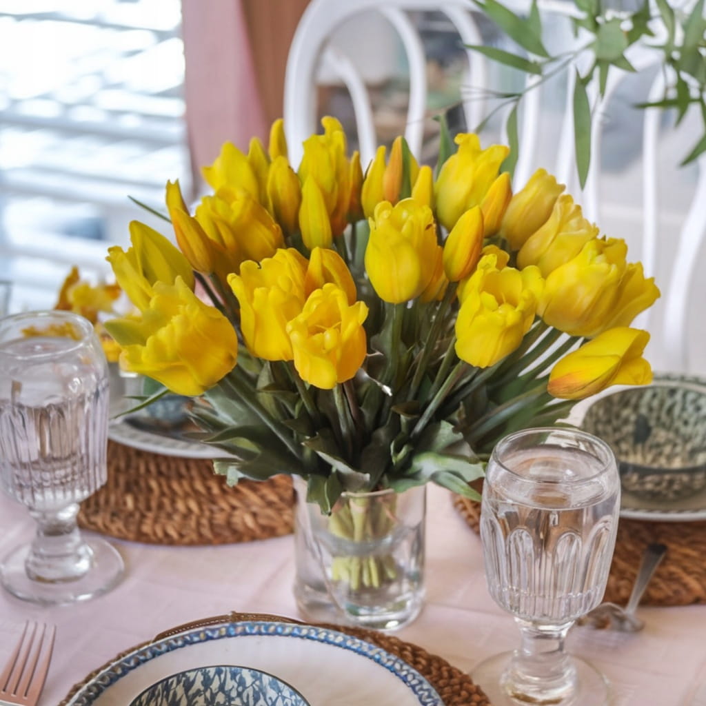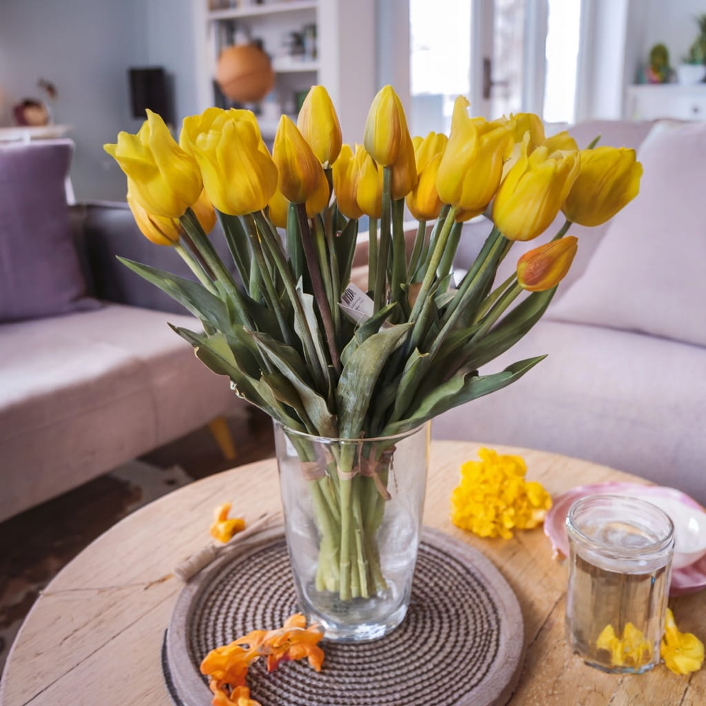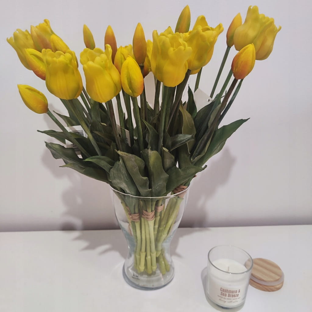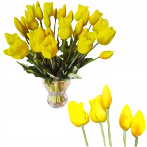 Sztuczne tulipany silikonowe zachwycają swoim realistycznym wyglądem – każdy detal, od delikatnych płatków po zielone liście, został starannie wykonany. Elastyczne łodygi umożliwiają dowolne układanie bukietu, dostosowując go do każdego wazonu i przestrzeni. Silikonowa struktura sprawia, że kwiaty są odporne na zagniecenia i uszkodzenia, co gwarantuje ich długowieczność. Intensywny żółty kolor dodaje wnętrzom ciepła i energii, a jednocześnie pozostaje odporny na blaknięcie.
