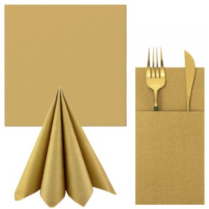Zestaw premium: złote serwetki oraz etui na sztućce do eleganckiego nakrycia stołu. Wykonanie z flizeliny sprawdzi się na przyjęciach w stylu glamour, w tym na weselu, urodzinach i sylwestrze.