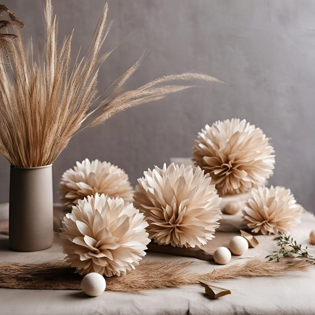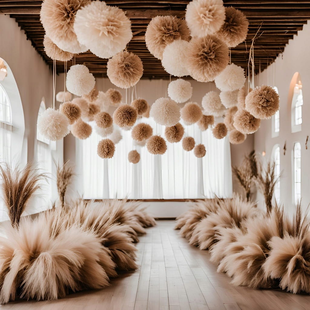 W aranżacjach ślubnych ecru świetnie wygląda w połączeniu z bielą, beżem i zielenią liści. Zawieś pompony na kilku wysokościach nad stołem lub w strefie zdjęć, aby uzyskać miękki, przestrzenny efekt. Przy stylu boho dodaj wstążki lub delikatną koronkę, a przy rustykalnym – jutowy sznurek i papierowe etykiety. Ponieważ zestaw nie zawiera sznurka, dobierz mocowanie odpowiednie do miejsca montażu. Do uzupełnienia aranżacji zobacz także dekoracje wiszące.