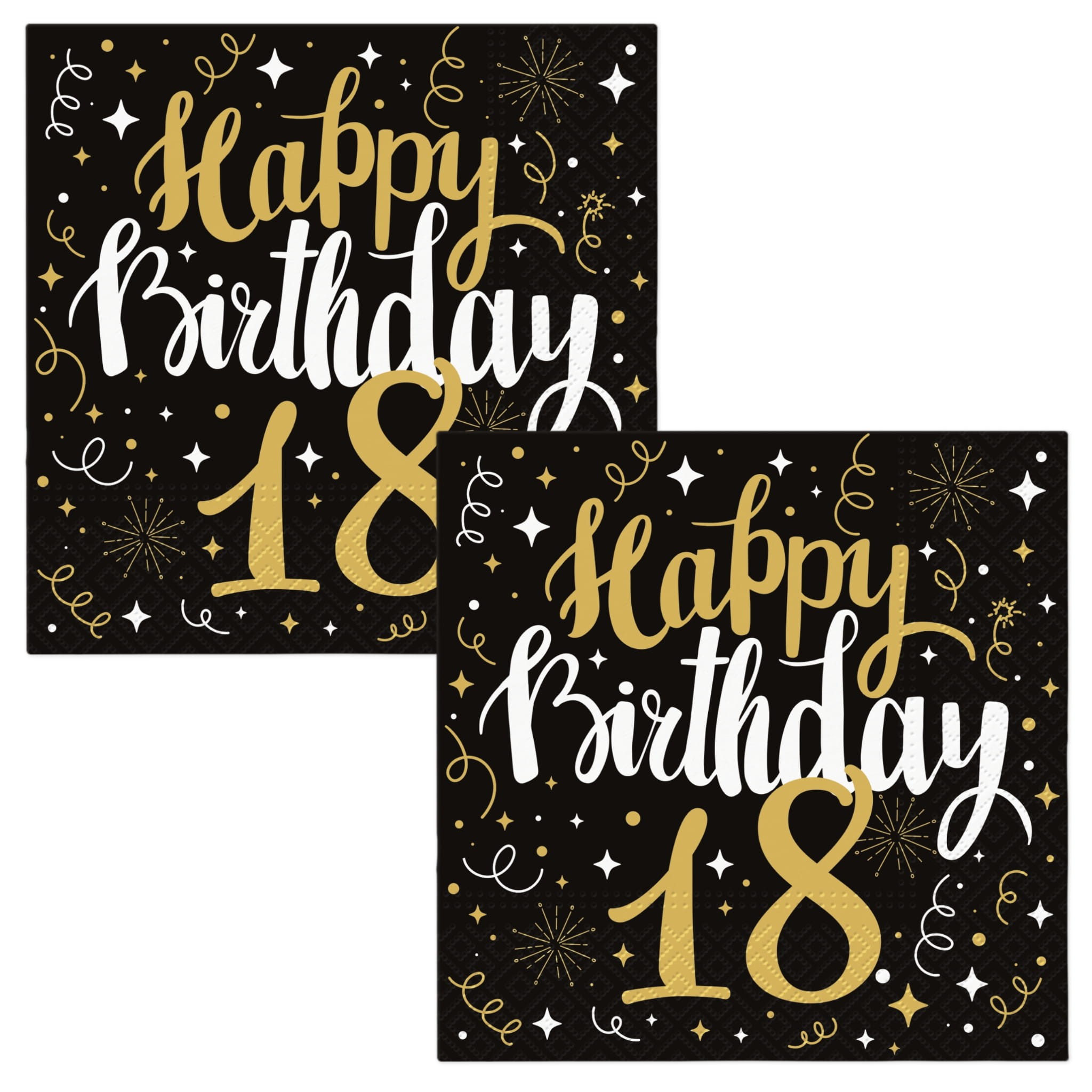 Serwetki papierowe na 18 urodziny w kolorze czarnym ze złotym nadrukiem „Happy Birthday”. Format 33 x 33 cm i opakowanie 20 sztuk sprawdzą się jako praktyczny dodatek do urodzinowego stołu.