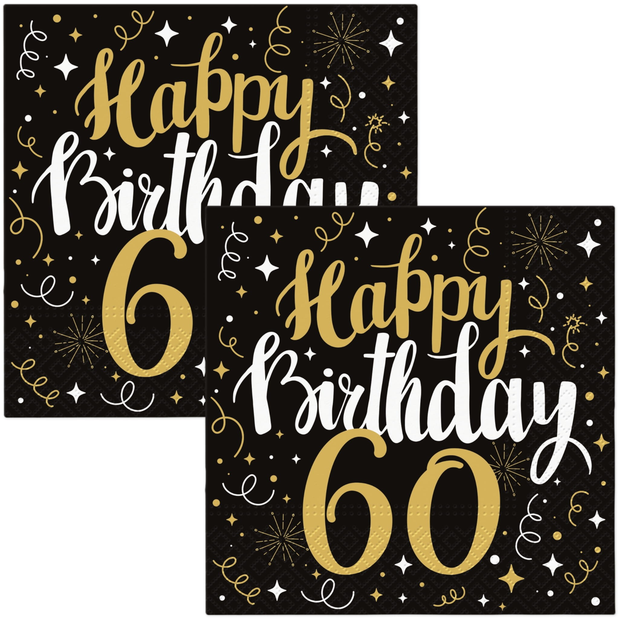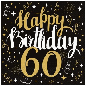 Serwetki papierowe na 60 urodziny w kolorze czarnym ze złotym nadrukiem „Happy Birthday”. Format 33 x 33 cm i opakowanie 20 sztuk sprawdzą się jako praktyczny dodatek do urodzinowego stołu.