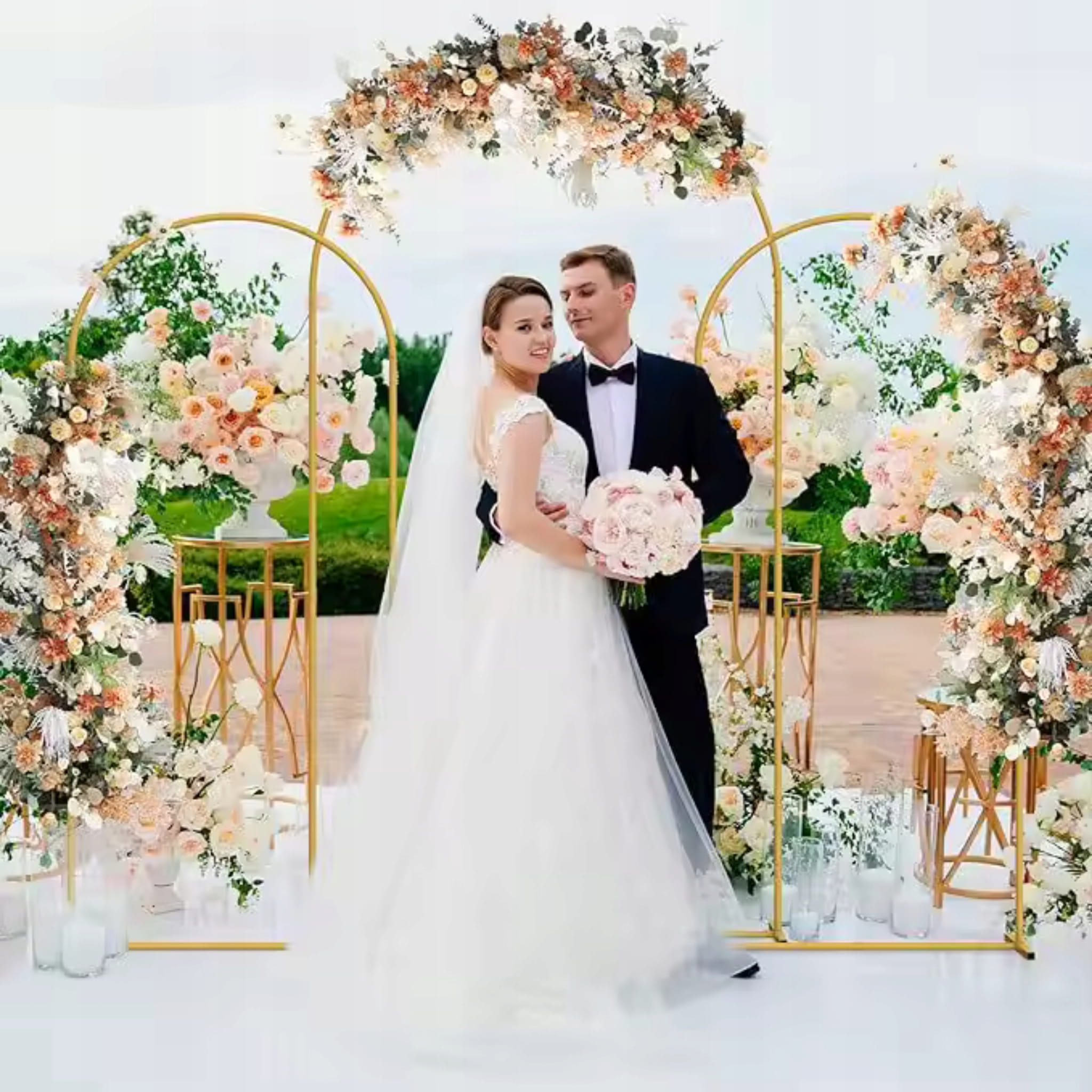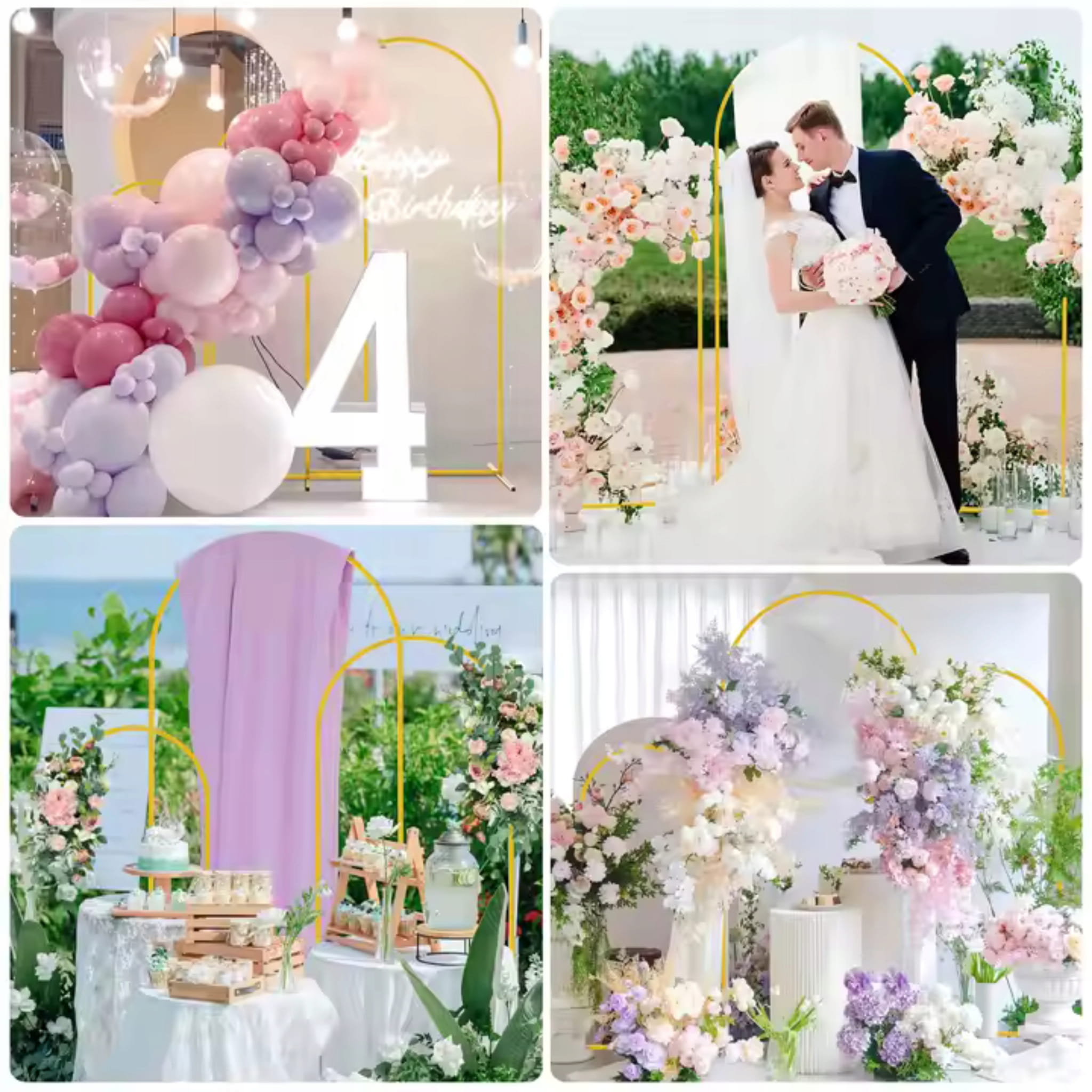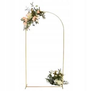 Metalowy stelaż dekoracyjny w kształcie łuku/bramy o wymiarach 200x100 cm, malowany na złoty kolor. Stabilna baza do tworzenia wejść, alejek, tła do zdjęć oraz dekoracji z balonów i kwiatów.
