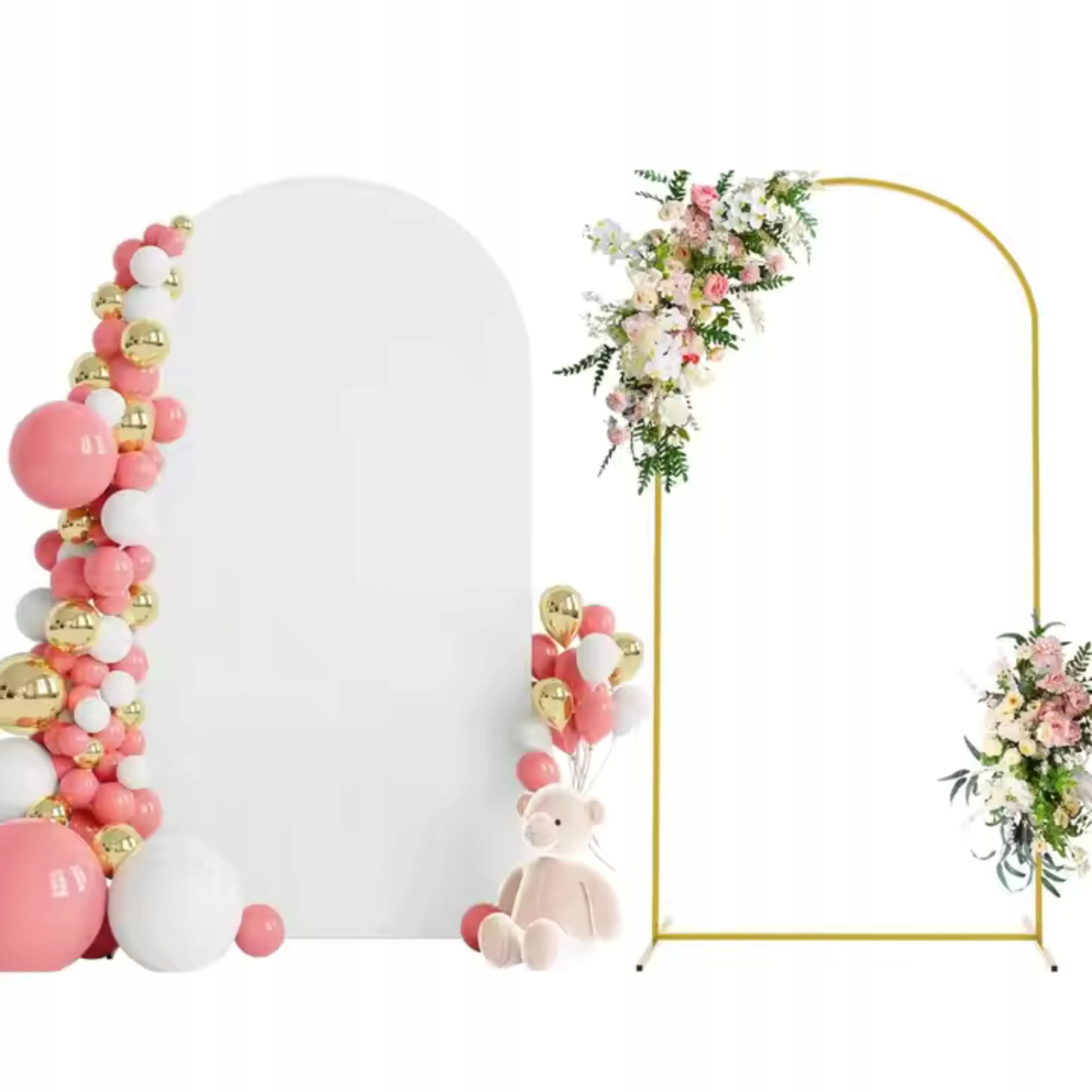 Połącz stelaż z girlandą balonową po jednej stronie łuku, a drugą część zostaw bardziej „lekką” i elegancką. Dla spójnego efektu dobierz 2–3 kolory balonów i dodaj akcenty w złocie. Jeśli chcesz uzyskać gładkie tło pod aranżację, rozważ dopasowany pokrowiec, który stworzy jednolitą powierzchnię do zdjęć. Zobacz też inne konstrukcje i dodatki w kategorii stelaże i pokrowce.