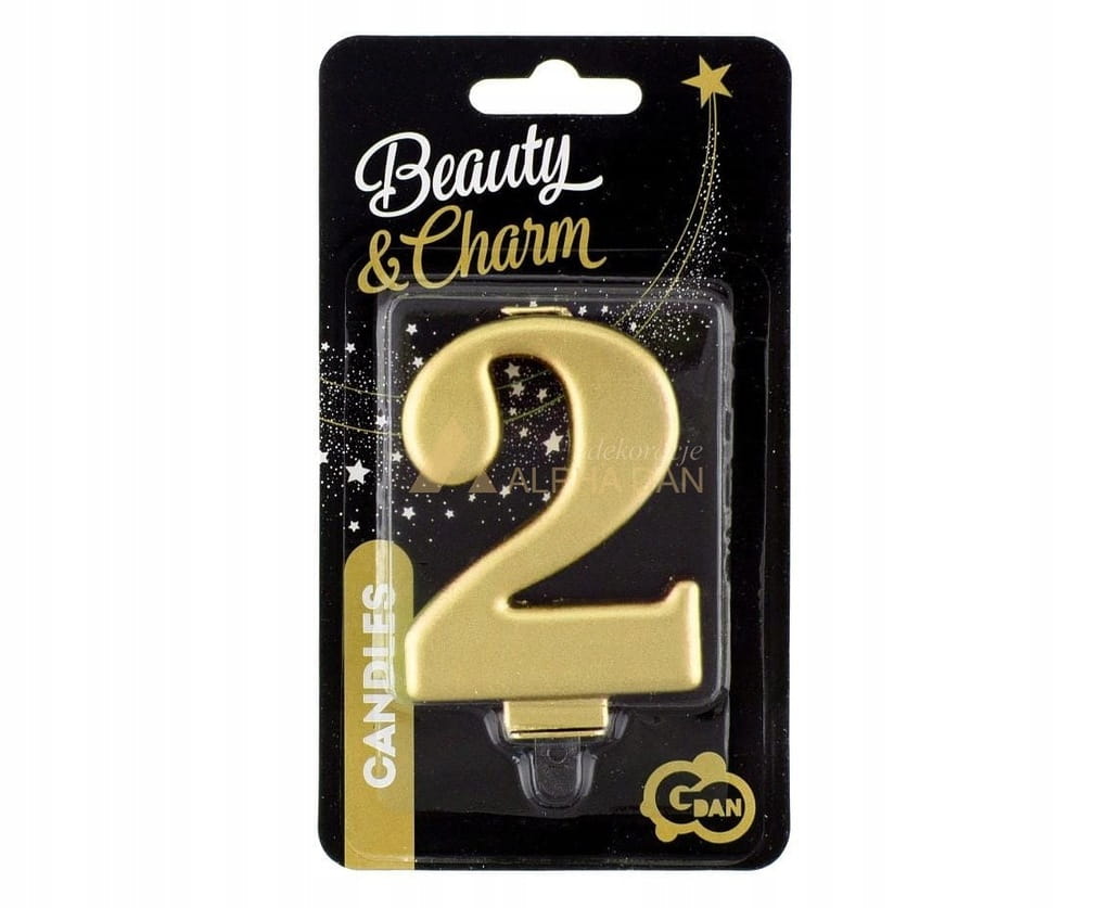 Złota, metaliczna świeczka urodzinowa w kształcie cyfry 2. Pasuje na urodziny, rocznice i jubileusze, a także do tworzenia liczb z innymi cyframi. W opakowaniu 1 sztuka.