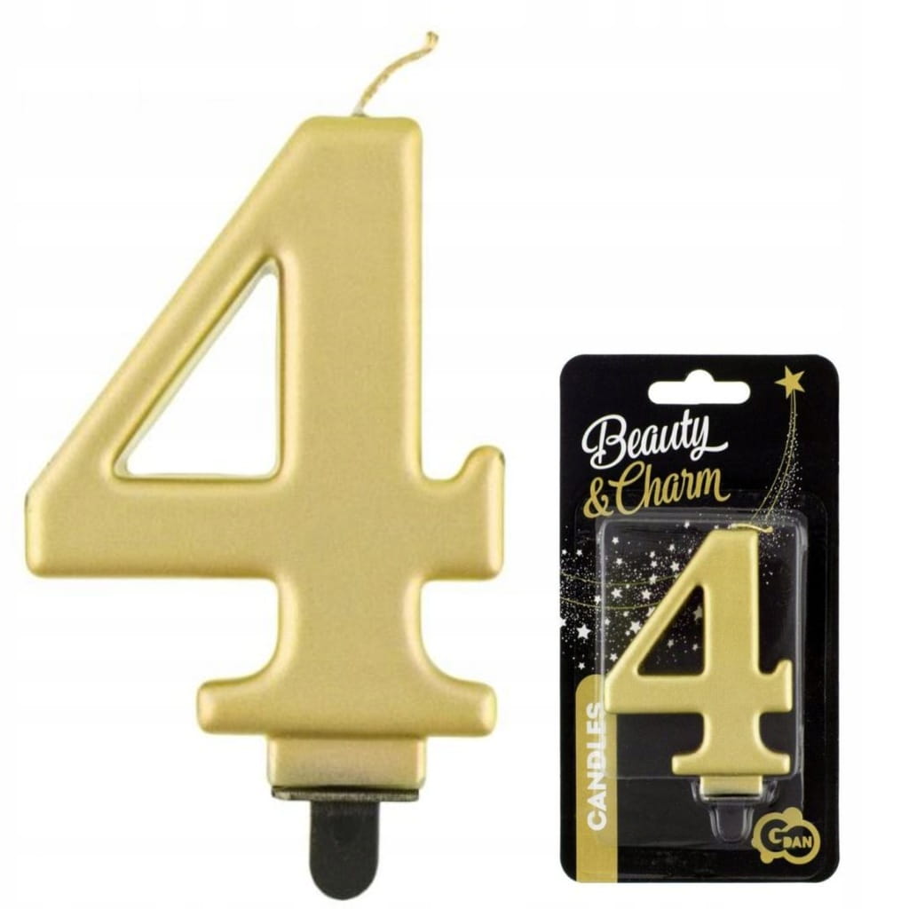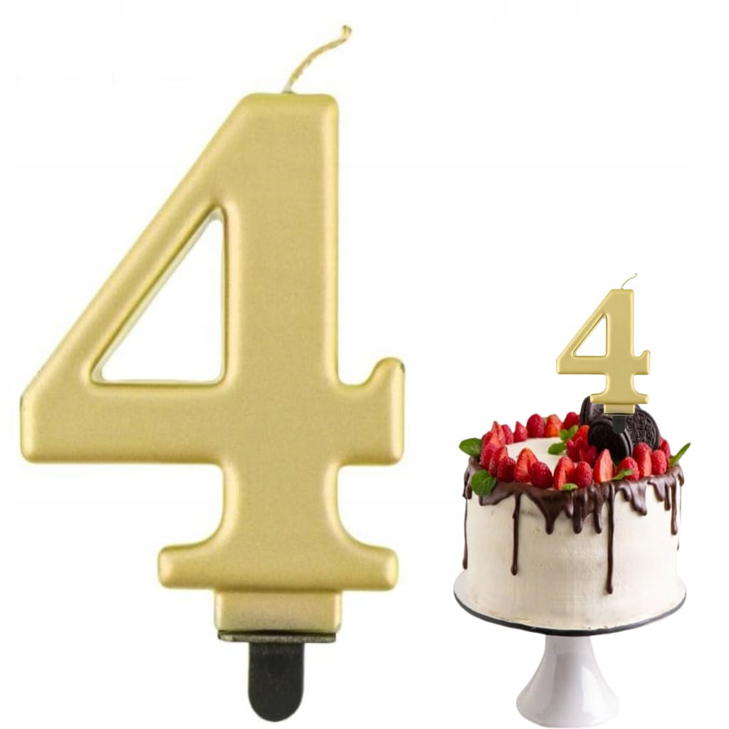 Połącz cyfrę 4 z pozostałymi świeczkami w tym samym stylu, aby stworzyć wiek lub datę, a całość dopasuj do złotych dodatków na słodkim stole. Przy stylu glamour dobrze sprawdzają się kontrasty (złoto + biel lub złoto + czerń), które podkreślają metaliczne wykończenie na zdjęciach. Jeśli tort ma minimalistyczny wygląd, sama świeczka może być głównym akcentem dekoracyjnym. Więcej dodatków do wypieków znajdziesz w dziale dekoracje tortu.