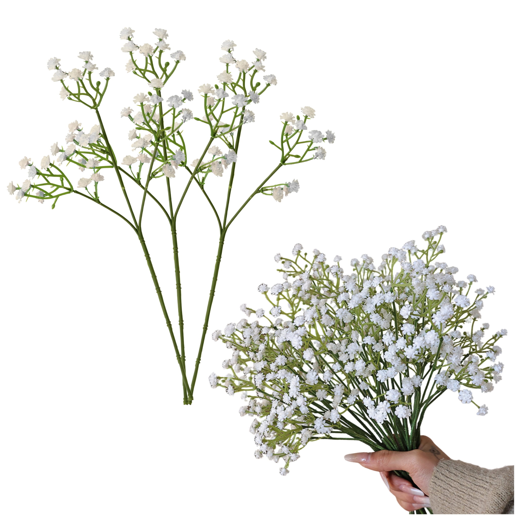 Zestaw 3 sztucznych gałązek gipsówki w kolorze białym o wysokości ok. 28 cm. Do bukietów, stroików, kompozycji florystycznych i dekoracji okolicznościowych. Wykonane z tworzywa sztucznego.