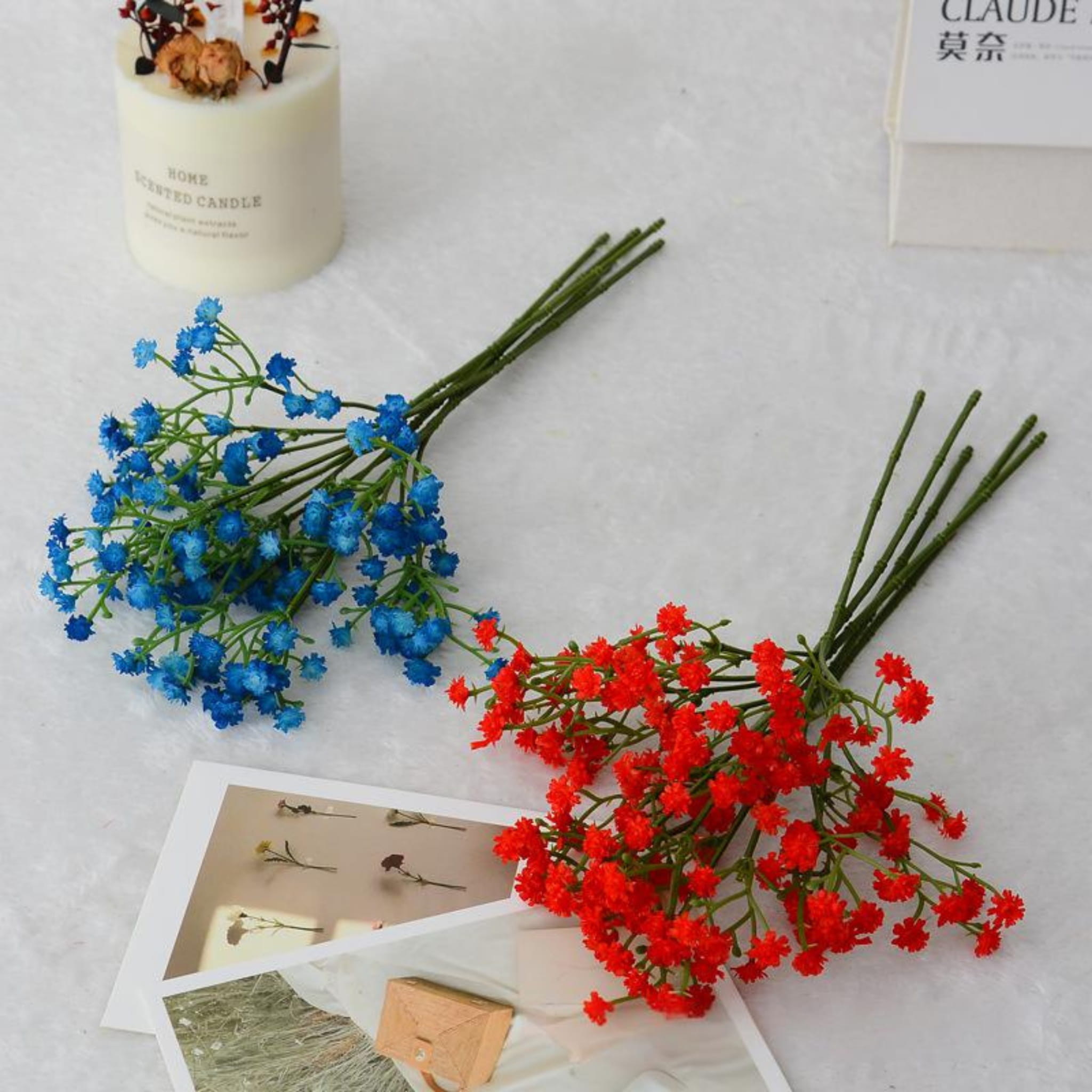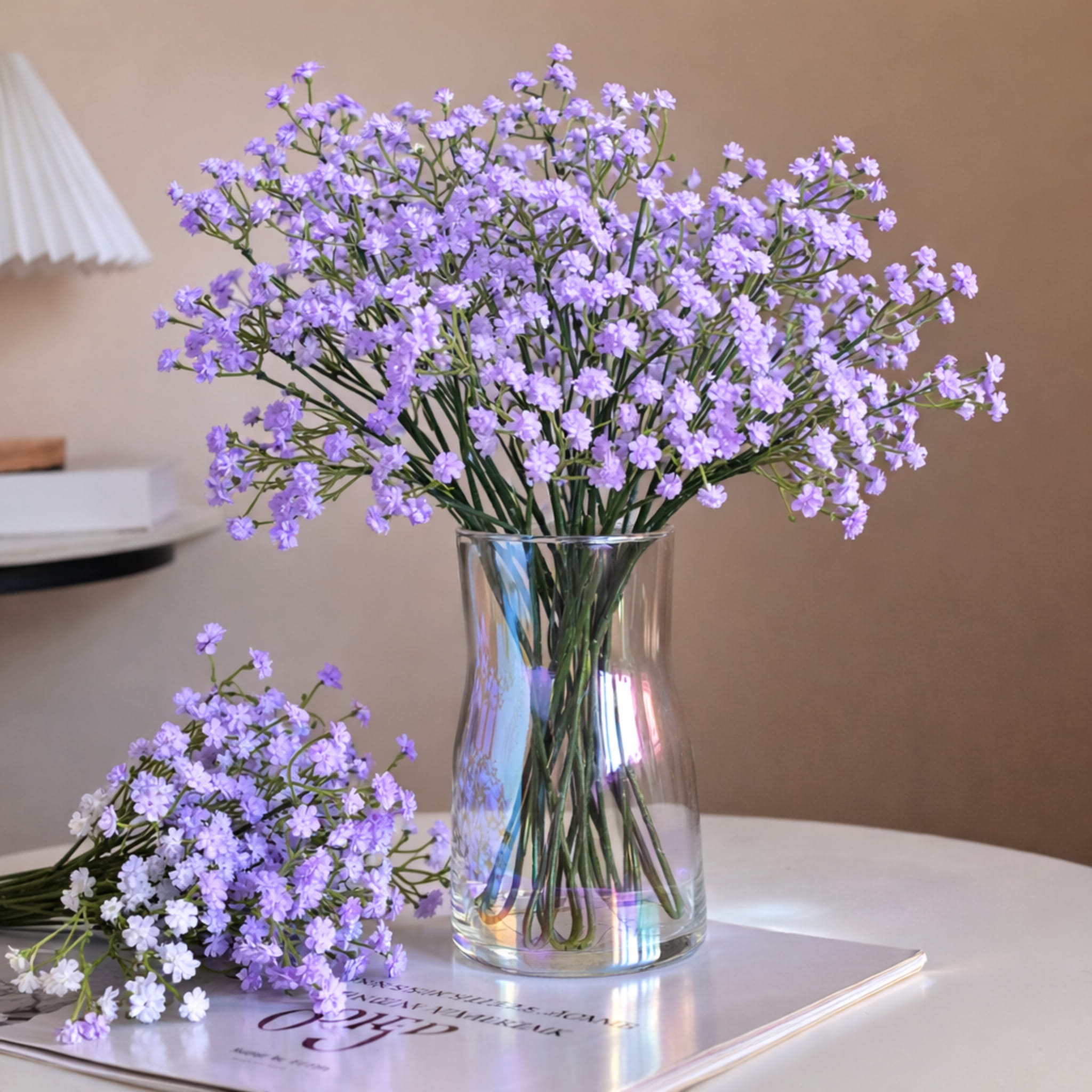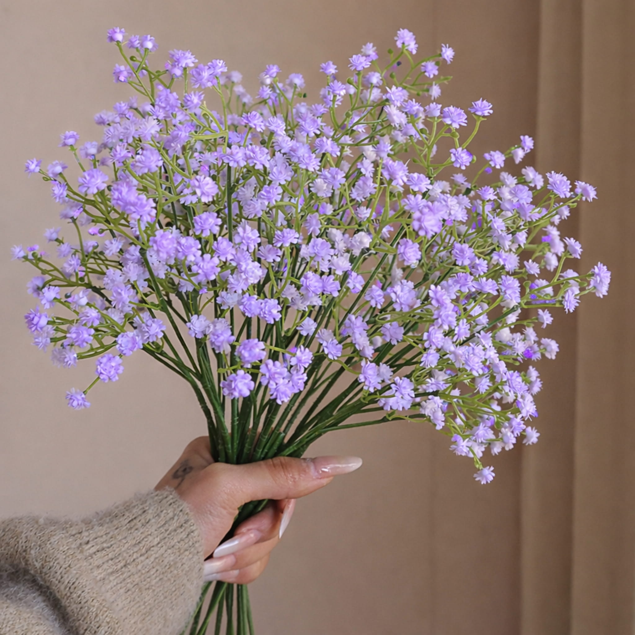Lawendowa gipsówka w formie sztucznej gałązki to lekki element dekoracyjny, który dobrze uzupełnia bukiety i kompozycje florystyczne. Wysokość ok. 28 cm pozwala wykorzystać ją w wazonie, wiankach, boxach kwiatowych oraz stroikach na różne okazje. Zestaw zawiera 6 sztuk, dzięki czemu łatwiej zbudować pełniejszą aranżację lub podzielić elementy na kilka mniejszych dekoracji. Gałązki wykonane są z tworzywa sztucznego, dlatego nie wymagają pielęgnacji i mogą być używane wielokrotnie.