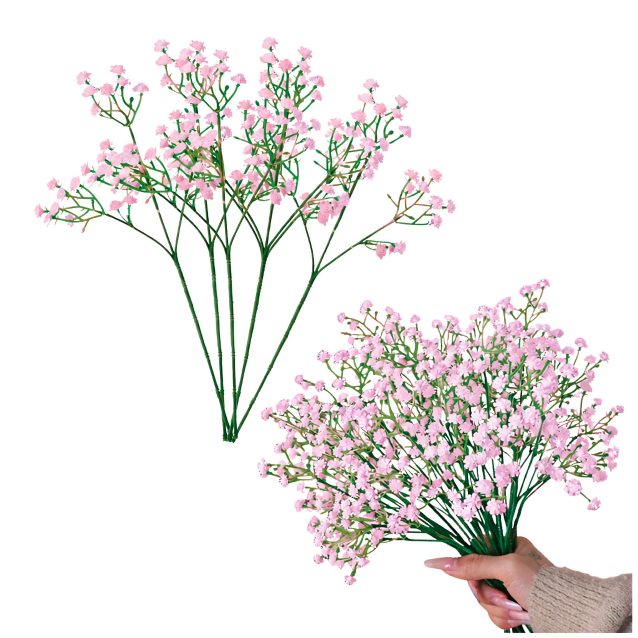 Zestaw 6 sztucznych gałązek gipsówki w kolorze różowym o wysokości ok. 28 cm. Idealne do stroików, bukietów, kompozycji florystycznych i dekoracji okolicznościowych.
