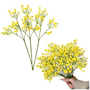 Zestaw 3 sztucznych gałązek gipsówki w kolorze żółtym o wysokości ok. 28 cm. Do bukietów, stroików, kompozycji florystycznych i dekoracji okolicznościowych.