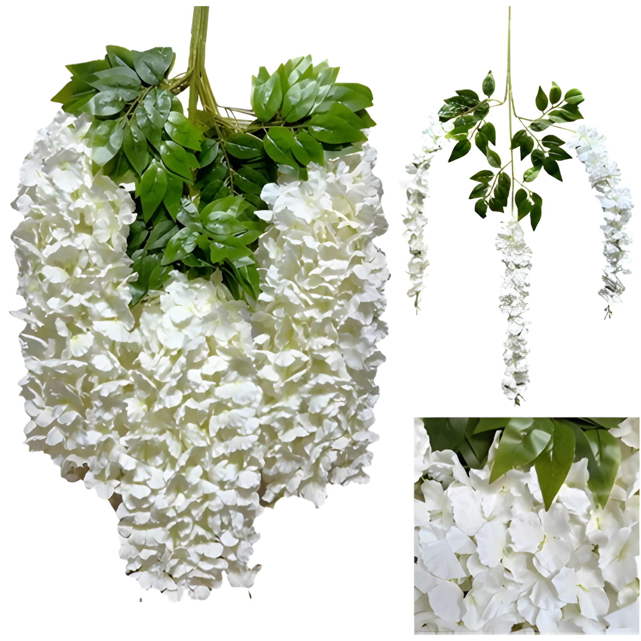 Zestaw 12 sztucznych girland wisterii (glicynii) w kolorze białym, o długości 105 cm każda. Sprawdzi się jako dekoracja wisząca do aranżacji ślubnych, komunijnych oraz do wystroju wnętrz i przestrzeni eventowych.