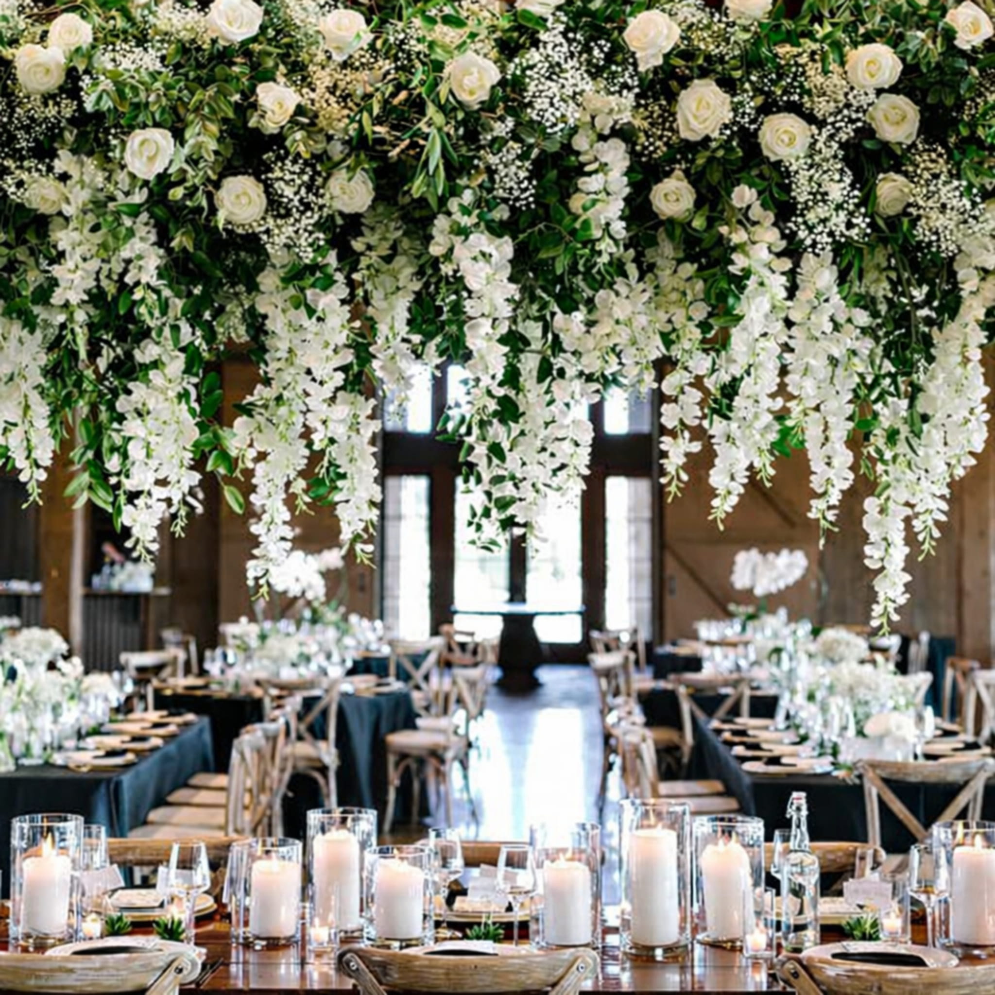 Biała wisteria to klasyczna dekoracja, która dodaje aranżacji lekkości i romantycznego charakteru. W zestawie otrzymujesz 12 zwisających girland o długości 105 cm każda, dzięki czemu łatwo zbudujesz spójną kompozycję. Girlandy nadają się do dekorowania ścianek, łuków, sufitów i balustrad. To praktyczne rozwiązanie do wielokrotnego użycia w dekoracjach okolicznościowych oraz w wystroju wnętrz.