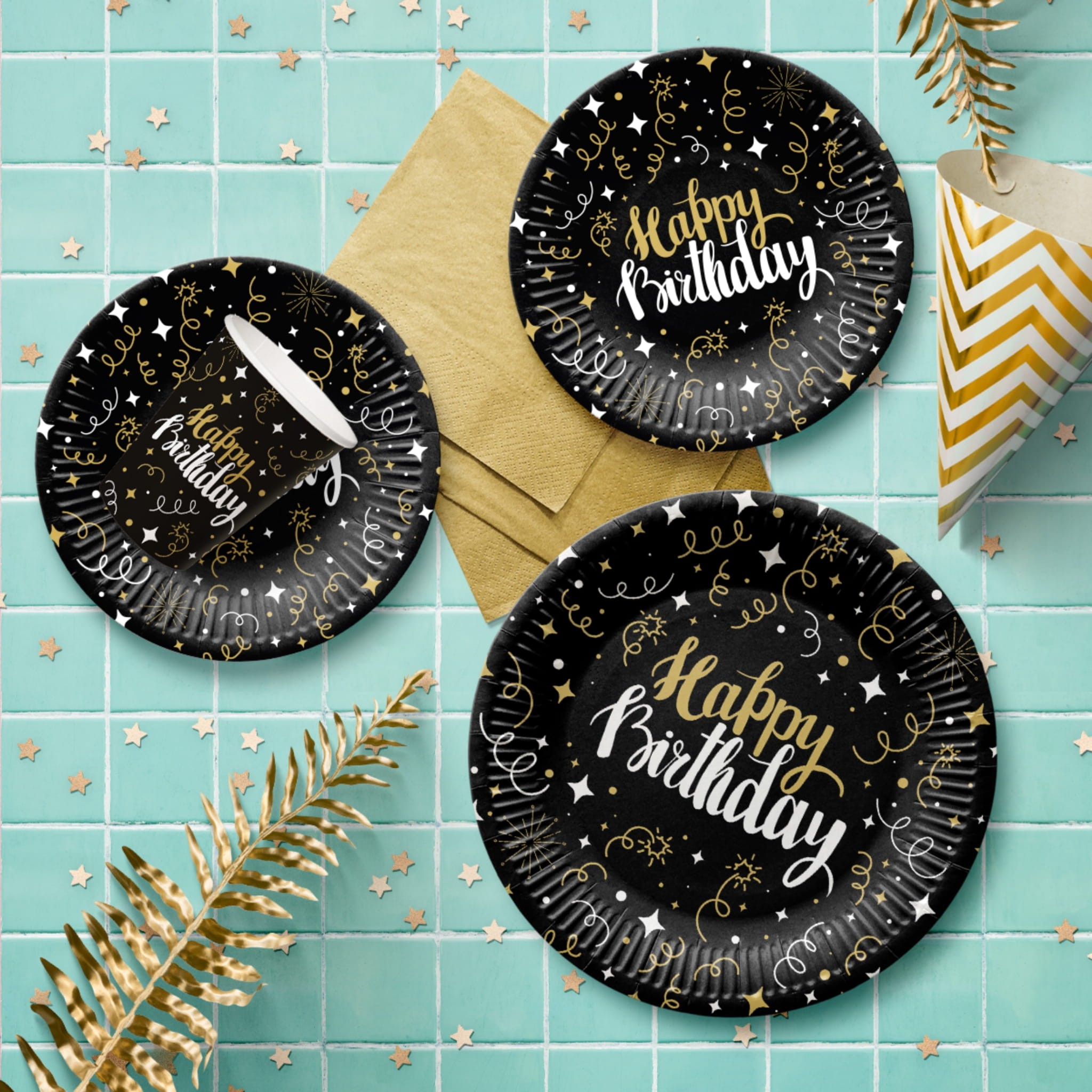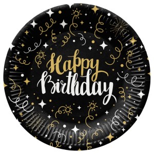 Okrągłe talerzyki papierowe w kolorze czarnym ze złotym napisem „Happy Birthday”. Średnica 23 cm i zestaw 8 sztuk sprawdzą się na urodzinowym stole w stylu glamour.