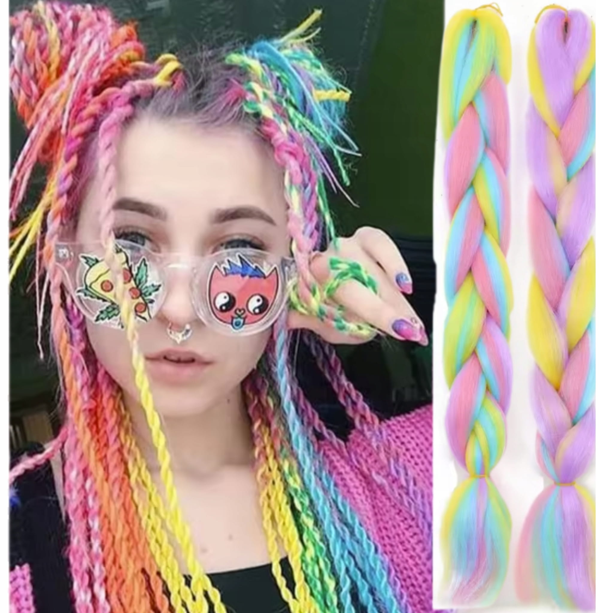 Luźne pasmo włosów syntetycznych do zaplatania w warkoczyki w kolorystyce ombre kolorowe. Długość 120 cm, 1 sztuka w opakowaniu, waga ok. 0,1 kg.