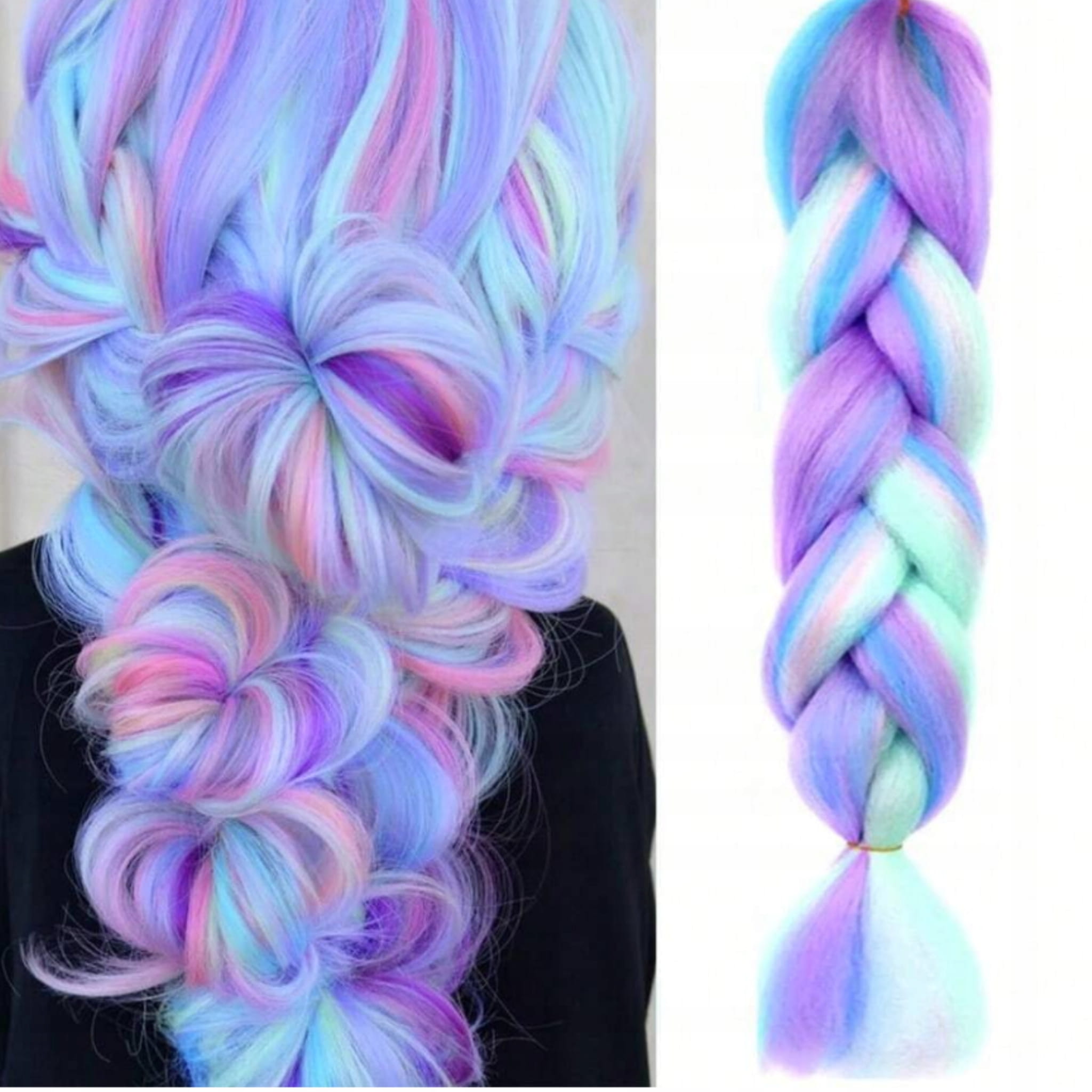 Luźne pasmo włosów syntetycznych do zaplatania w warkoczyki w kolorystyce ombre kolorowe. Długość 120 cm, 1 sztuka w opakowaniu, waga ok. 0,1 kg.
