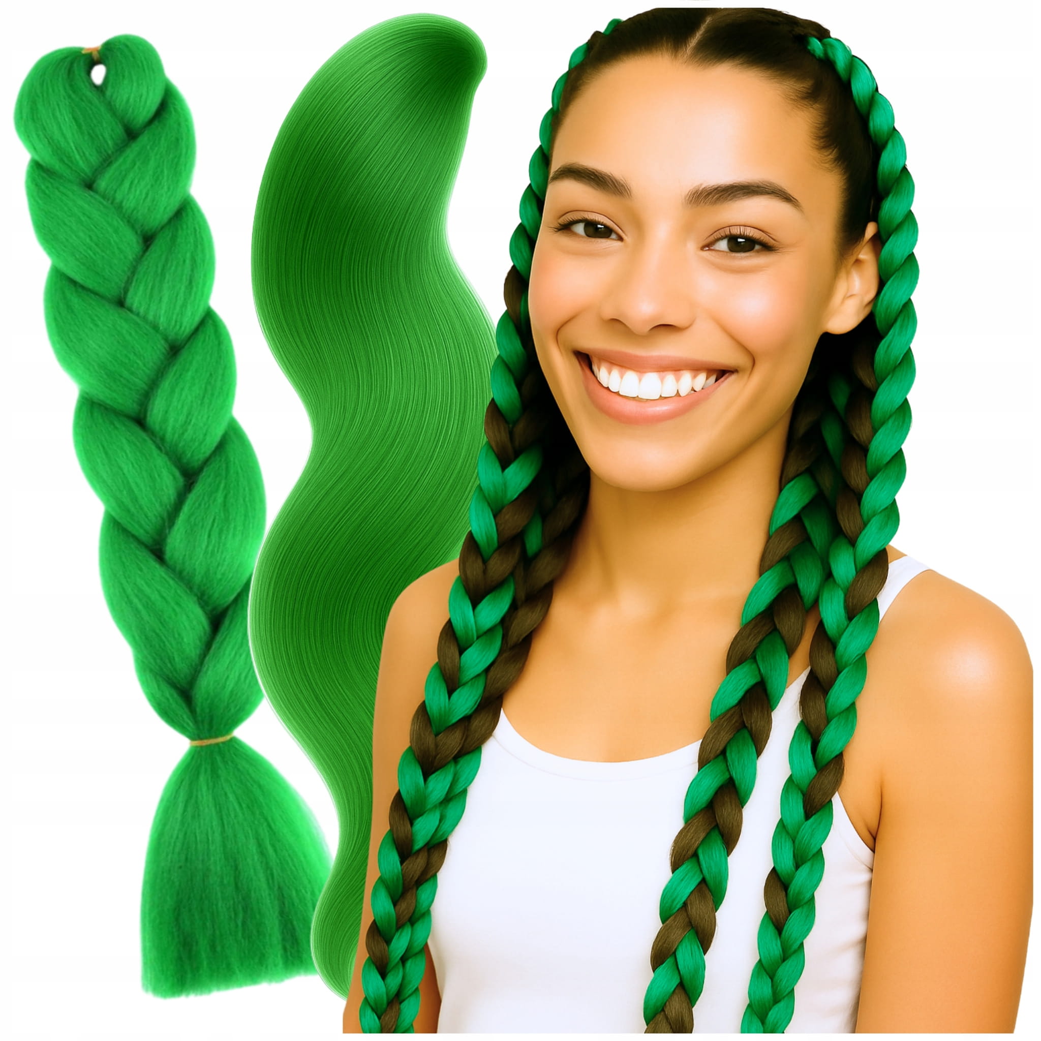 Zielone włosy syntetyczne do zaplatania o długości 120 cm. Idealne jako doczepy do tworzenia kolorowych warkoczyków i stylizacji na imprezy. W opakowaniu 1 sztuka.