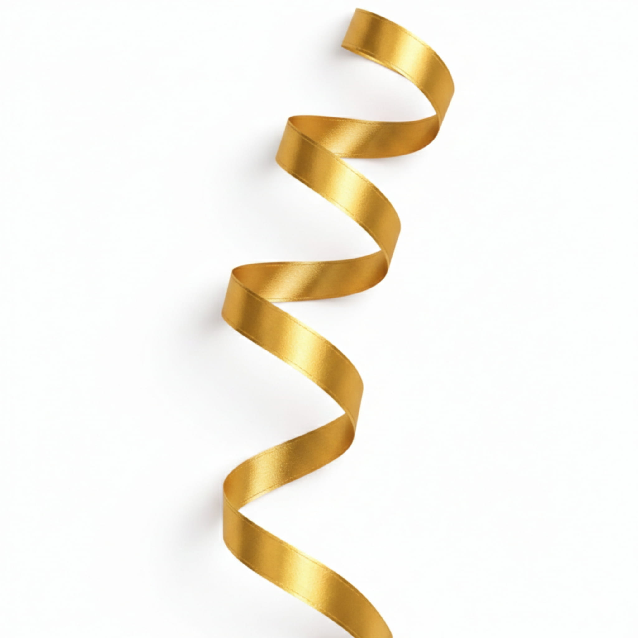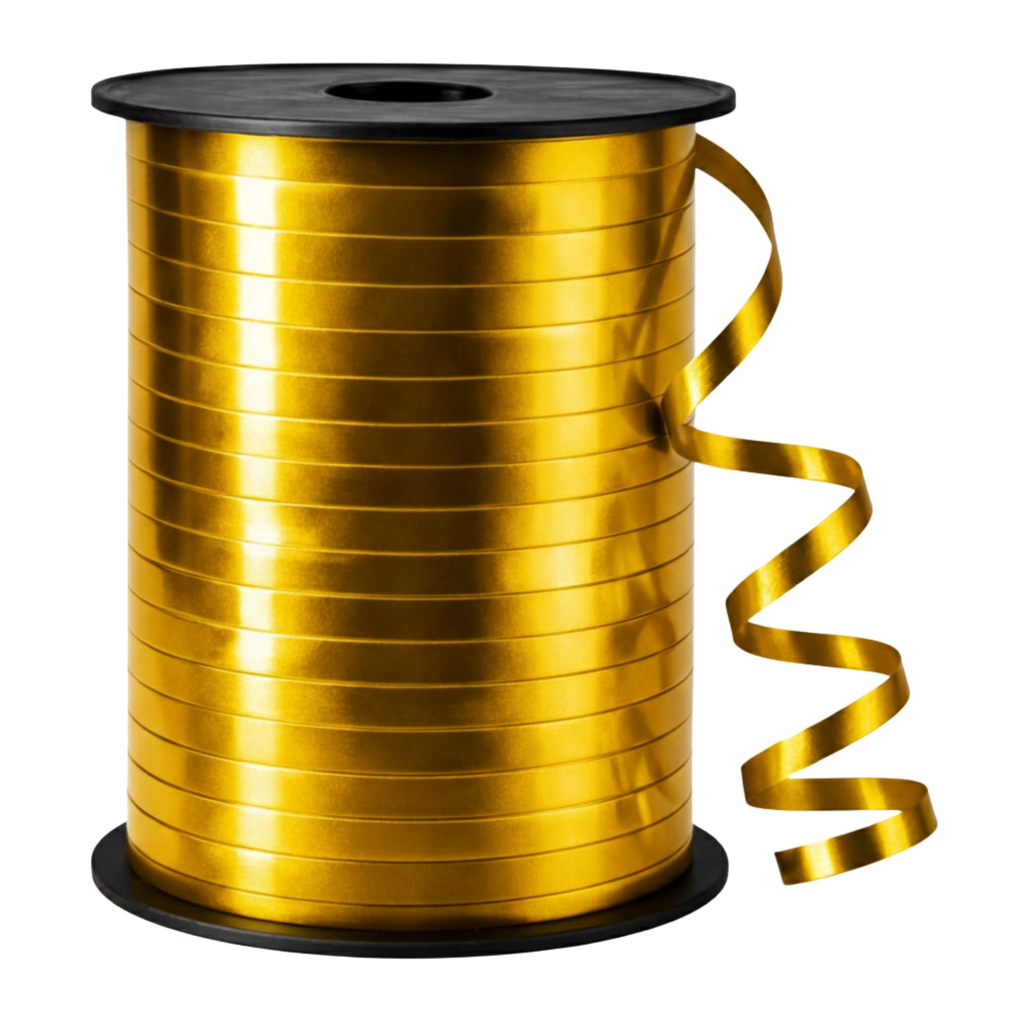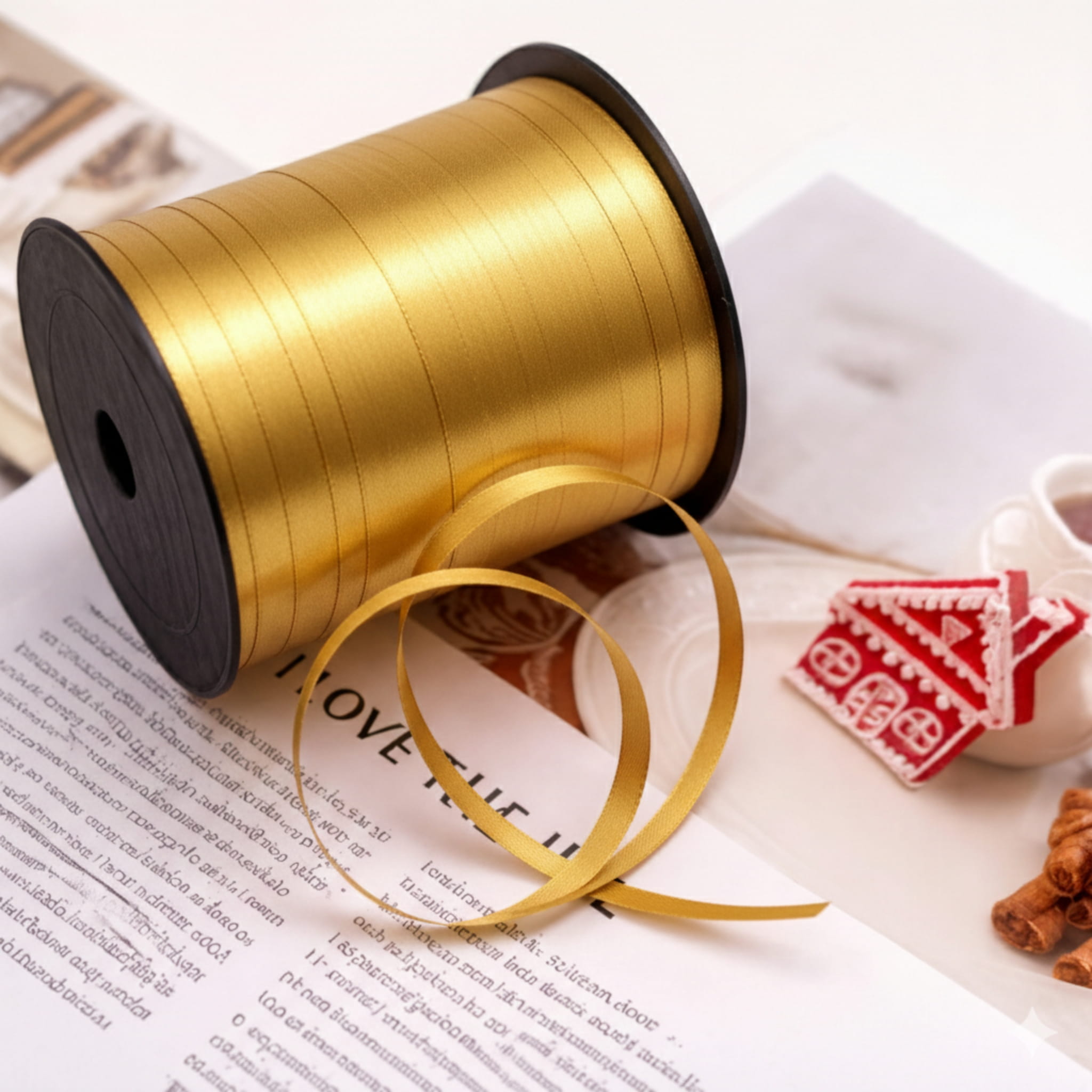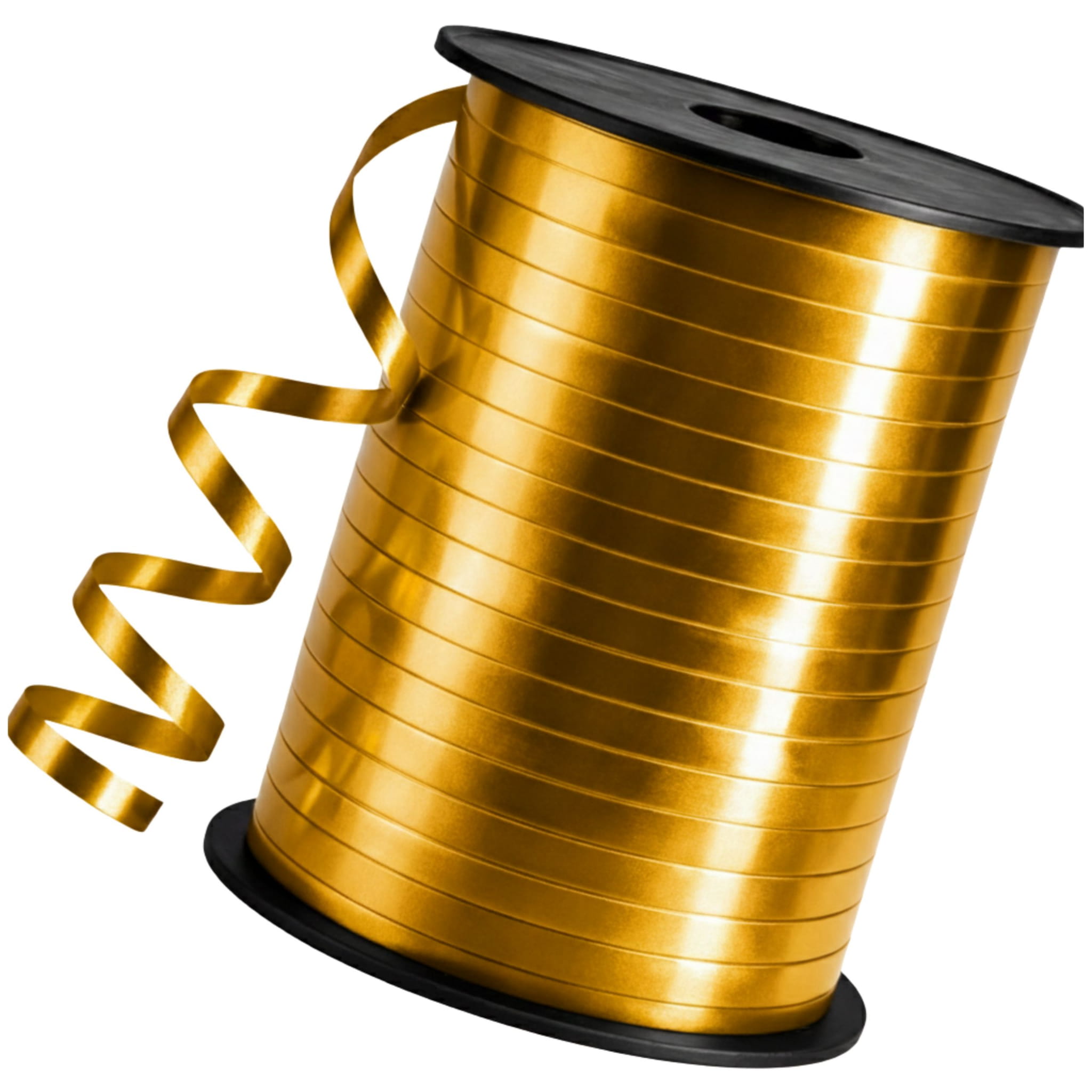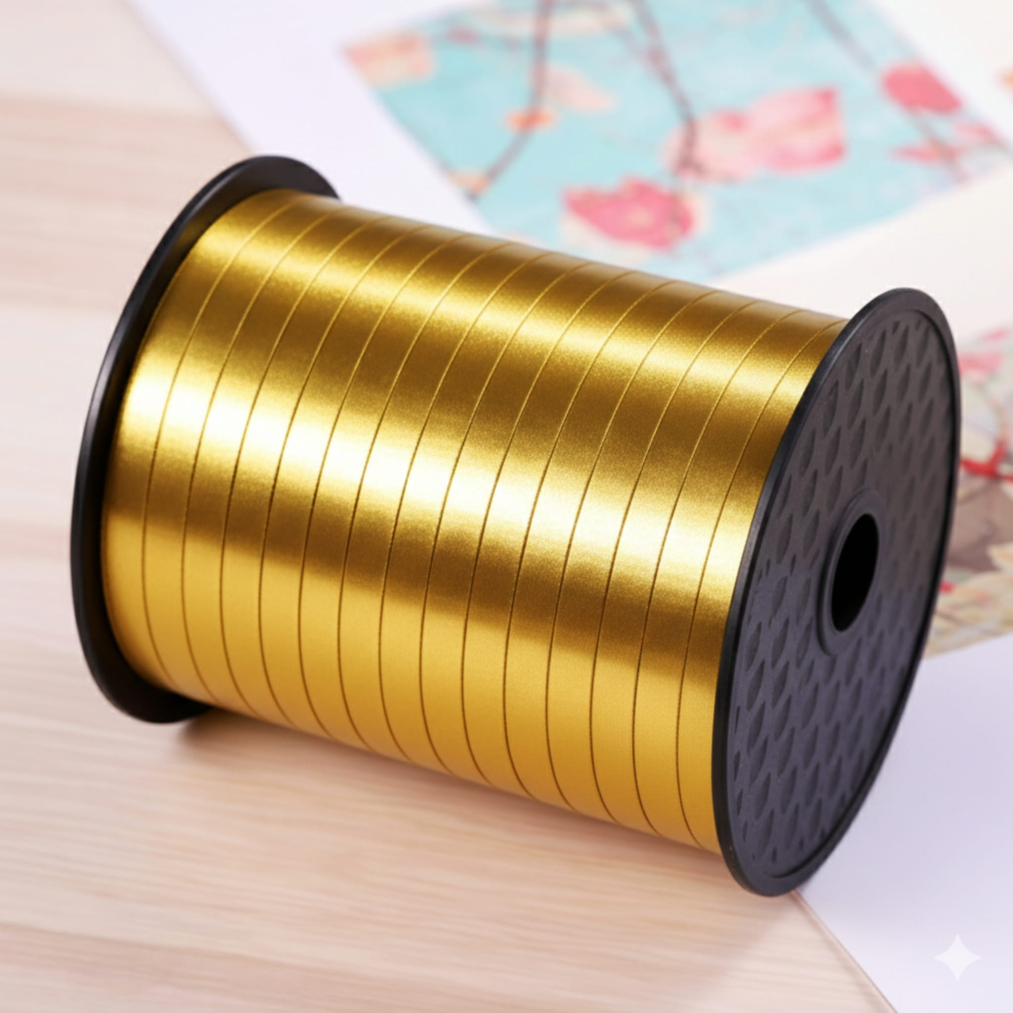 Złota wstążka do balonów z metalicznym połyskiem w rolce 225 m. Mocna tasiemka do wiązania balonów, tworzenia kokard i wykańczania dekoracji.